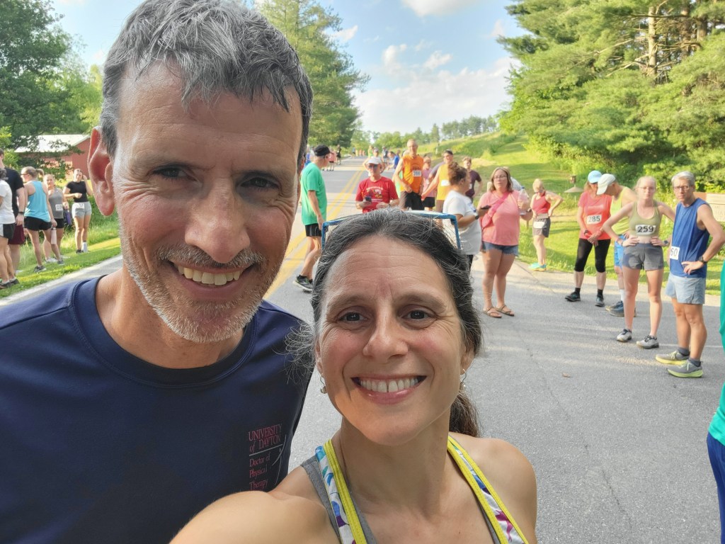 Julie was coming into race #3 hot and wiped – not a great cocktail for a hot and hilly trail race. The fast pace we had been keeping up in our first two states plus 2 hard races were already starting to catch up with her and Ryan was only looking more and more loose and relaxed. But she still wasn’t ready for this to be the first time Ryan would pass her on a race course. Well, life doesn’t wait for you to be ready. Julie started out this hilly, hot trail run whose formidability the locals were hinting at in the pre-race mingle, with some strength and confidence – taking the uphills with some temperance and sailing down the downhills, which undulated fairly evenly back and forth. By mile 1.5, the heat started to creep up with her and each new hill was less and less inviting. Before the race, the announcers and crowd made it clear to everyone – this was not a pr course – this was one of those “makes you feel alive to take on the challenge” type of courses. This was evident in both Julie and Ryan’s first mile, a 9:28 and 9:34 respectively. With Ryan a mere 6 seconds behind Julie at the close of mile 1, you can begin to see what was coming in mile 2. While Ryan soldiered on and clocked into the second mile’s attempts to stop us at a solid 11:01, this is where he won the race against Julie who submitted a bit more willingly to the mile’s challenges with an 11:42. Even though Julie’s final pace for the last .85 miles beat Ryan’s at a 9:56 pace against Ryan’s 10:23 pace, the damage for Julie’s pursuits of marital victory was already thwarted. Ryan crossed the finish line after 29 minutes and 11 seconds, Julie at 29 minutes and 58 seconds. Both crossed the line sweaty, tired and ready for the post-race popsicles Marriage, of course is not about keeping score. That said, Julie 2 – Ryan 1. The game is most certainly on.