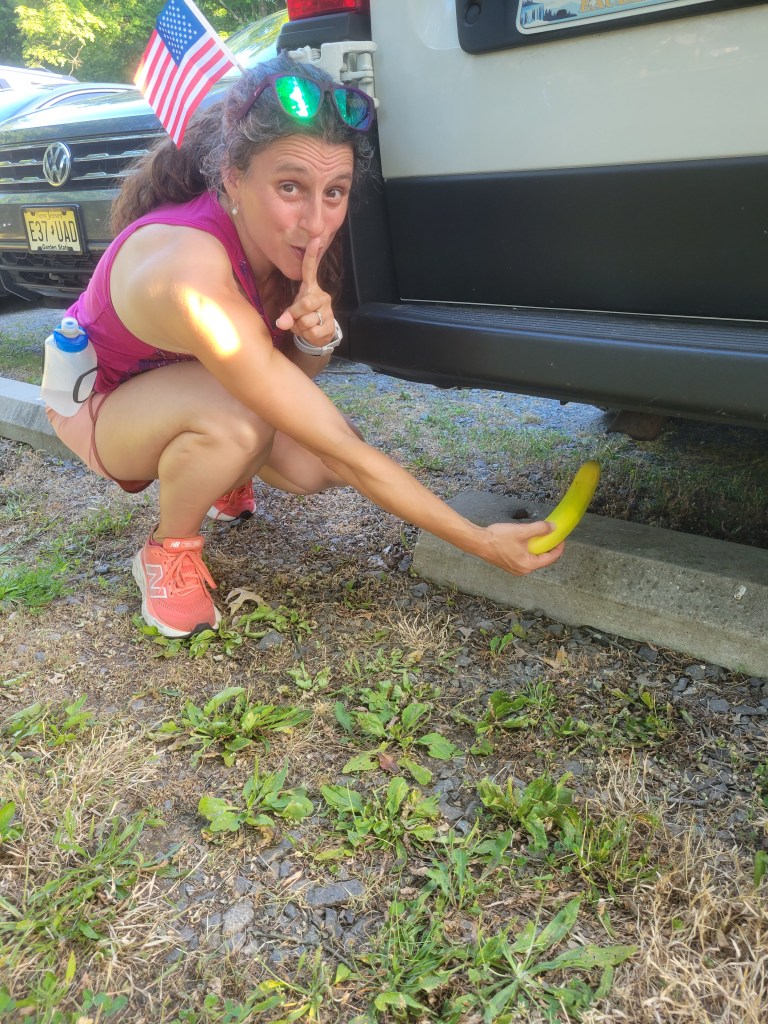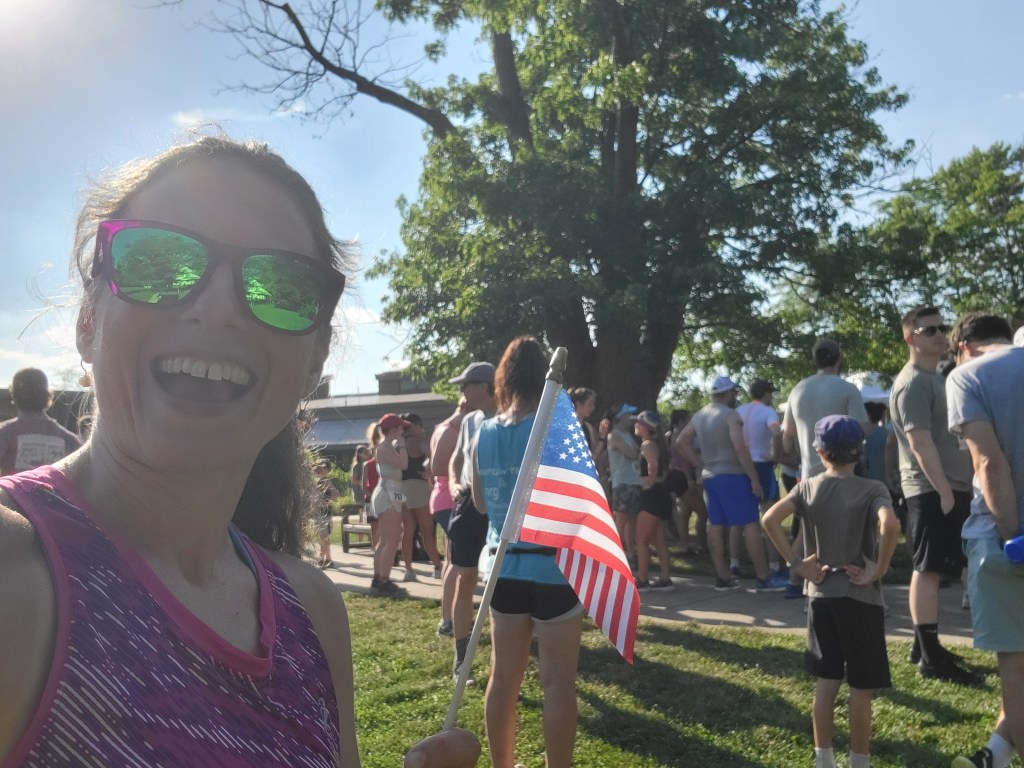 Thanks to the official heat advisory in place and a trail running course that was not built for speed, all runners were warned pre-race to set their expectations appropriately – this is not a PR course. Despite the discomfort of the heat, the temperature of the outside air was like a cool breeze compared to the hot box that was our current living space, so we were eager to get out into it. In Julie’s pre-race warm up, within 30 seconds of a light jog that barely clocked in under 11 minute miles, her heart rate quickly shot up into the 130’s…for Julie, this was actually a good thing. Now on race #4 and seeing that the biggest challenge of these races would be Julie’s inability to resist the urge to compete and do what Ryan was showing her how to do – take a few of the races easy. This early signal that running hard wasn’t much of an option helped her settle into it. Since we are running 5Ks once, sometimes twice or even 3 times in a week, we just can’t physically afford to run each of them like a race. But, just as Chris Farley like wingy, Julie like winny – having never had too much of a shot at the podium in her 30’s, it turns out, at 45, she can clean up and that competitive drive is one she is working to reign in. So, this race was perfect for taking it easy, seeing as there really wasn’t any other option. Julie’s entire goal was to run easy – no competing!