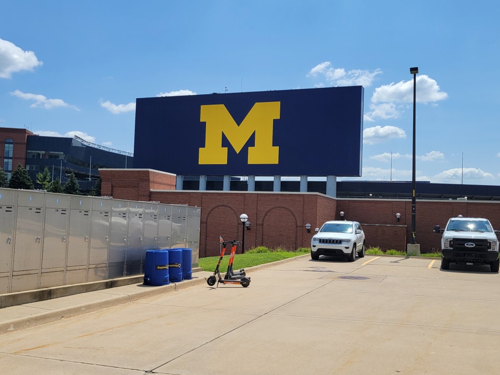On our first day in the Wolverine State, we drove through Ann Arbor to see where the Wolverines gather. We did a drive-by of the University of Michigan. Ryan thought it would be neat to see the stadium with that giant golden M proudly displayed. It was. We got some great pictures of it and would see those golden “M”s throughout Michigan. Julie came into the trip knowing fairly little about college football, but, between a visit to Ohio and then to Michigan, she got a pretty good education on things you do and don’t say when in each state.