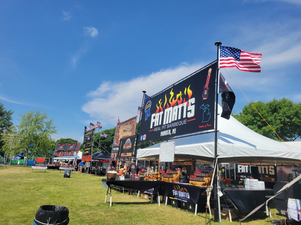 We showed up to the race site in the morning while the various rib vendors were still getting set up. Julie chatted with one of the vendors from California, who encouraged us to stop by their booth for ribs after the race. Julie had no problem assuring him that would happen. We ran the race alongside the Saginaw River (you can read about it in our 5K section) and, after ever so patiently waiting for the Ribfest to officially open, we made our way in like we owned the place.