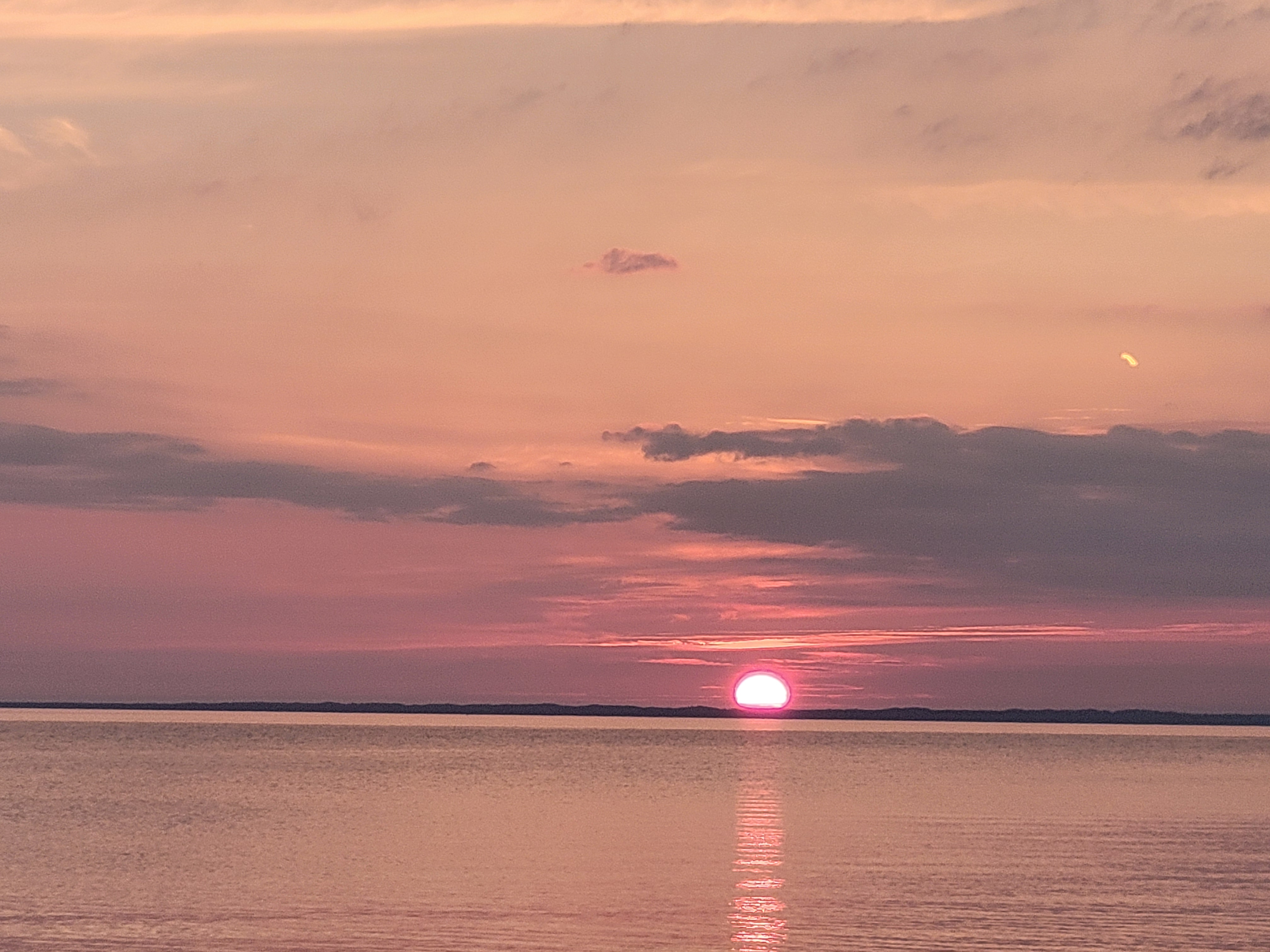 Being from Rochester, NY, on the shores of the eastern most Great Lake, Lake Ontario, we knew that a Great Lake was, well, pretty great. But we had no idea that a Great Lake could be as pristine and stunning as this. Lake Ontario is, well, not pristine, shall we say? The waters aren’t crystal clear. Here, they were that and more. Now, this was a bay of Lake Michigan, not the Lake itself, but we would soon learn that Lake Michigan, just like Grand Traverse Bay, had the clearest, most brilliantly blue waters we had ever seen. And the sunset lit up the sky with brilliant hues of purple and pink. What a place to be and what a place to celebrate a birthday, especially for someone who loves birthdays as much as Julie.