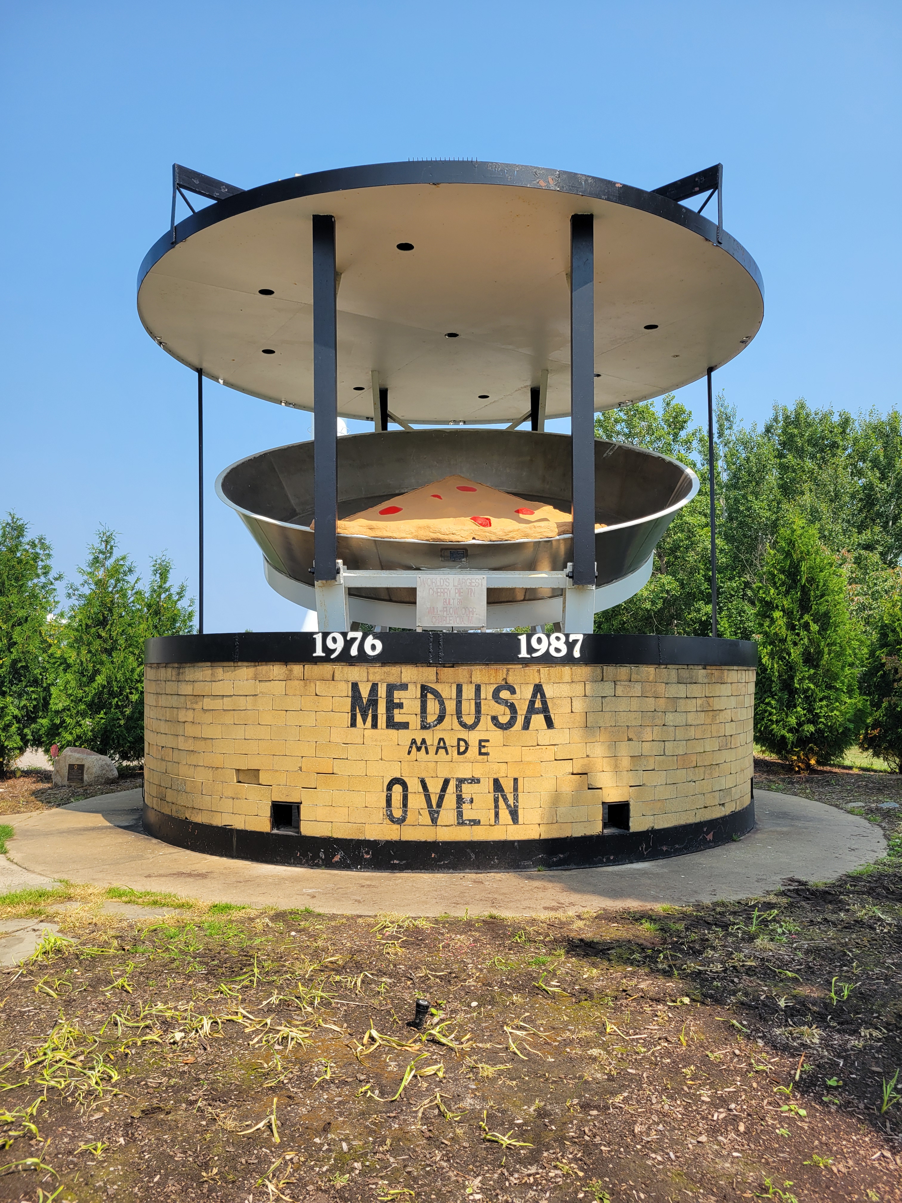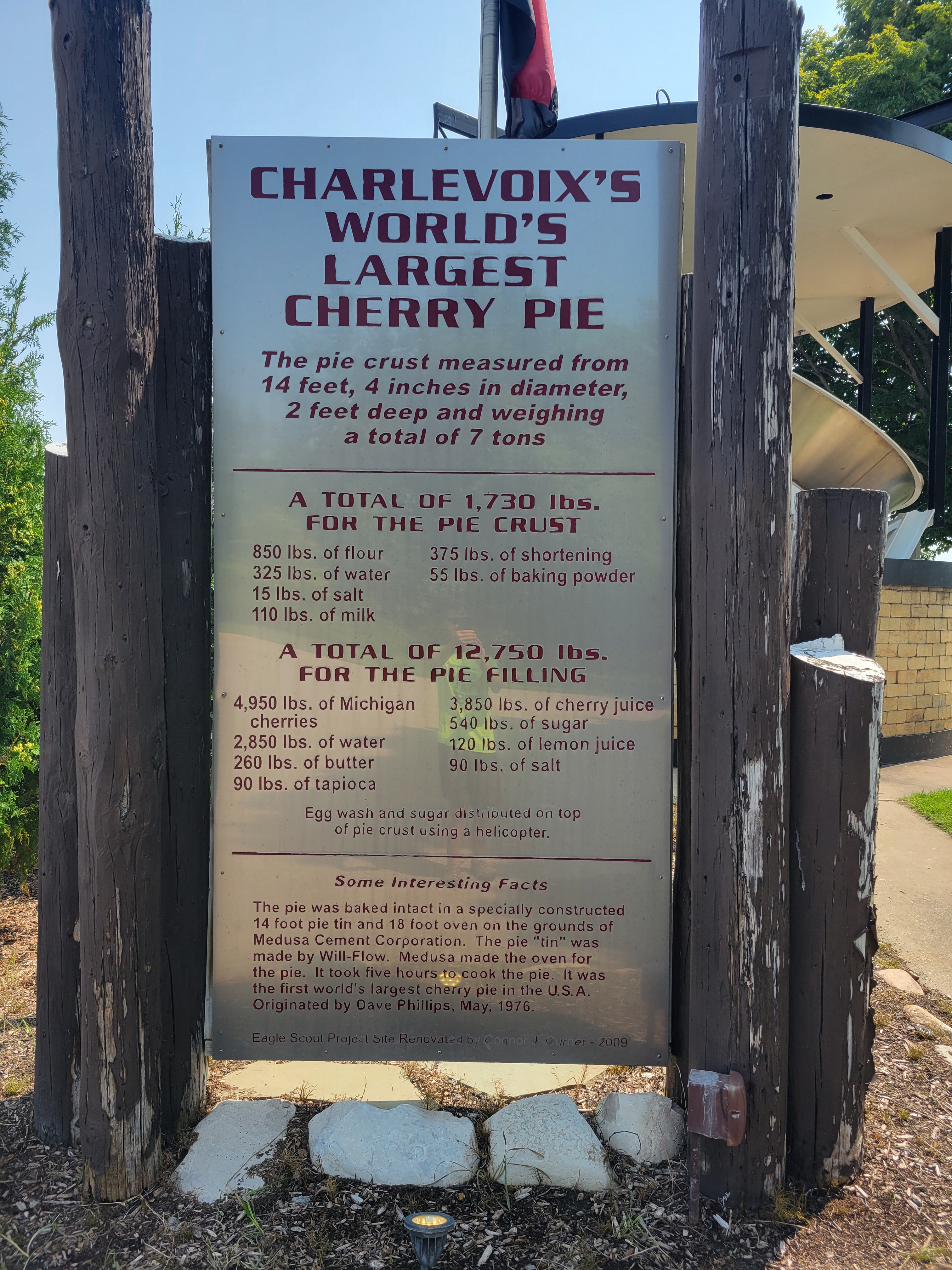 On our way to Charlevoix we stumbled upon a must-see sight that we didn’t realize we needed to see – the world’s largest cherry pie. In 1976, as part of America’s bicentennial fervor, a cherry pie weighing in at a respectable 17,420 pounds, (yes, you read that right) was baked as part of Charlevoix’s annual cherry festival, and its pie pan was there on display. The record was surpassed by Traverse City bakers in 1987, but for those eleven years how Charlevoix did shine.