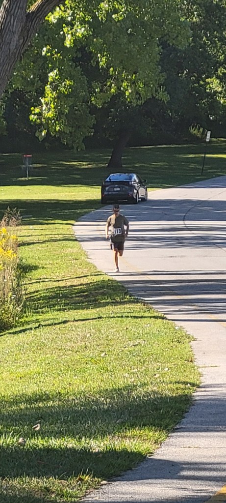 When the race started, Ryan and Julie headed out with speed. Julie’s hunger to lay down some speed in a small race was a back step after having managed herself so beautifully on the Illinois course. Julie reverted back to her old habit and turned in positive splits. Coming out of the gate way too fast, then slowing down to way too slow, it took her until a half mile in to find a pace she was fairly certain she could maintain. Once again, she was wrong. She has to accept that, until she recovers fully, a speed she can maintain for 3.12 miles at this point is one that is going to feel particularly slow to her in the first mile.