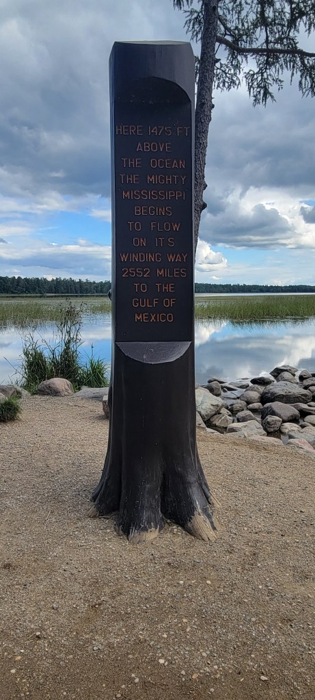Before arriving at the location of our Minnesota 5K, which we would run the next morning, we had one very important stop to make. For those of you who were, like Julie, completely ignorant of the significant geological geography of most of the country, and definitely of its midsection, the headwaters of the mighty Mississippi come out of Lake Itasca, located just a bit north of central Minnesota. We had to stop and see the birthplace of this iconic river. We weren’t sure if it was because we knew what the waters in this little stream would become or if it just was what it seemed, but something about the headwaters of the Mississippi felt a little magical. It was beautiful and humble to its destiny. We were not the only ones excited by it. The place was chock full of people enthusiastically taking pictures and wandering about this significant spot.