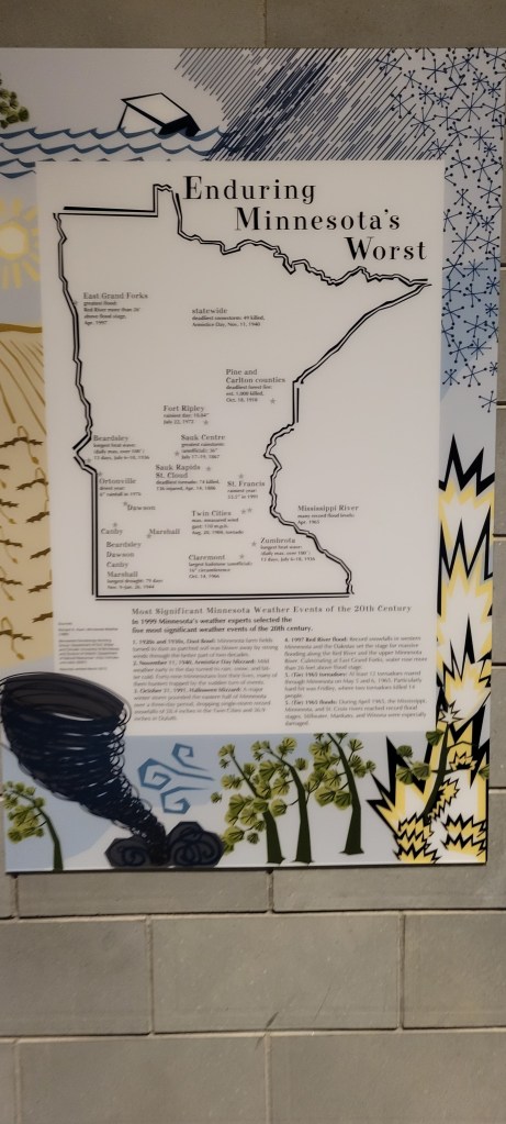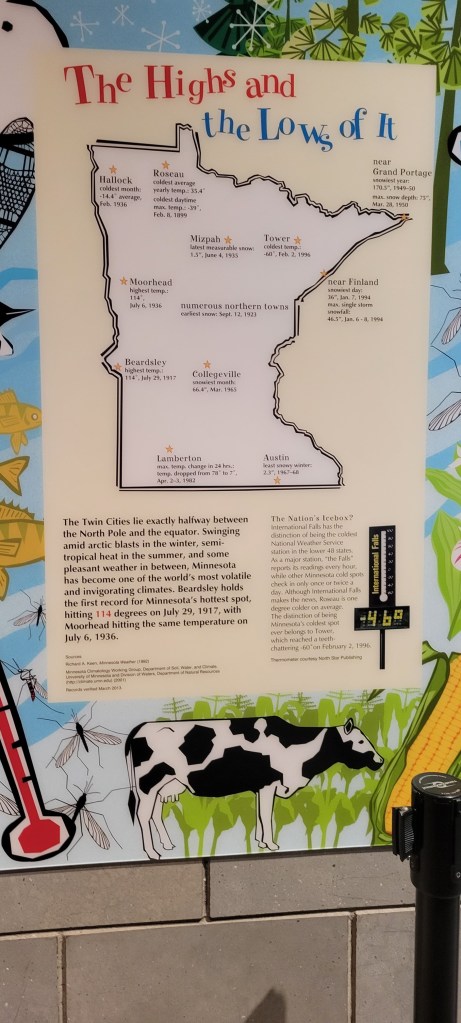 We made our way up to the Twin Cities with plans to take in a Twins game – our first baseball game of the trip. We had been trying to catch a game since the early days of the trip, our most notable miss being in Boston, where we had hoped to catch the Red Sox in action. We had settled for a stadium tour. Finally, we would get to have our first full-stadium experience. Before we hit the ball game, we got in a few hours at the state museum and learned all about the history and various elements of the cultures and activities in Minnesota…and about the weather.