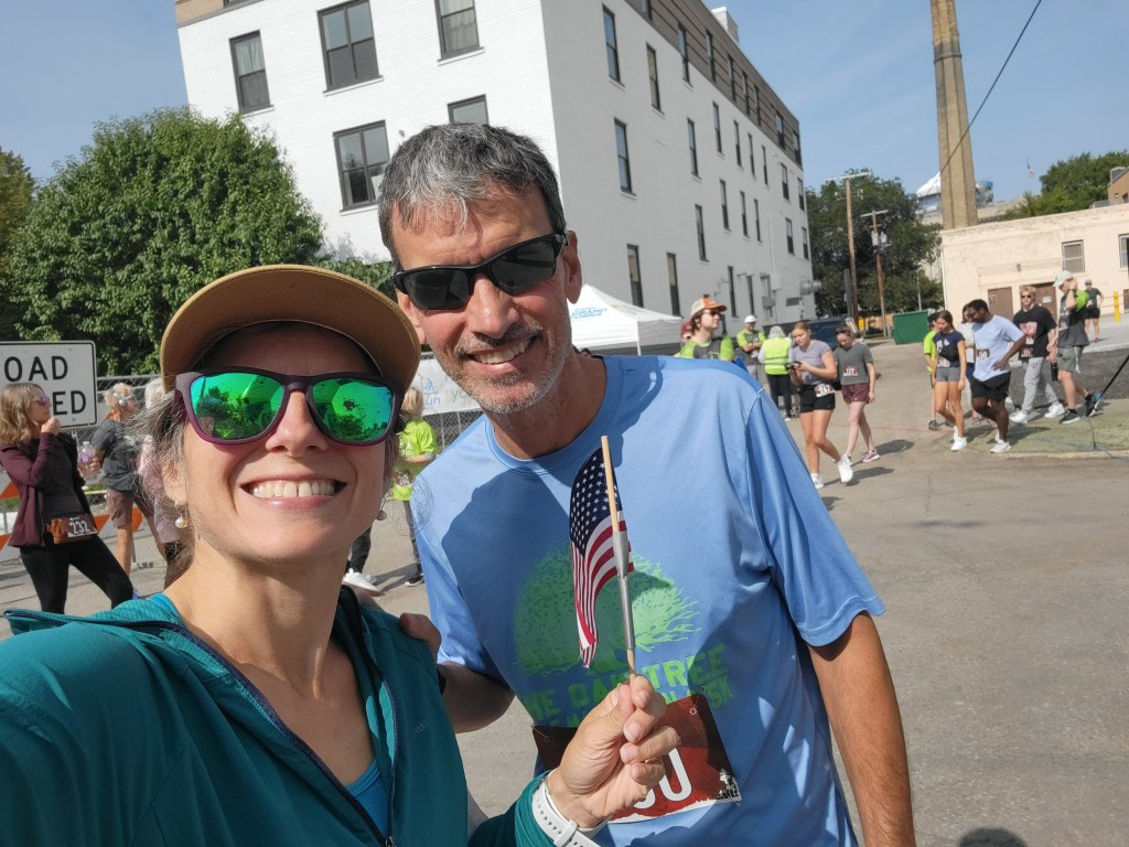 When the race started, Julie had a pretty strong sense that Ryan was going to be in an overall winning spot. One of the guys who might have been a contender was an enthusiastic University of North Dakota student who played football and was excitedly sharing with us before the race that this would be his first race ever. When the race started, Julie saw him burst out of the starting line past Ryan along with one other UND student. She had a pretty strong feeling that wasn’t a pace that was going to last for them. Julie, having run a ton of races and still not being great at picking the right starting pace (outside of a clear and structured training program that brings you to the starting line knowing pretty precisely where you stand and how to run), knew that very few amateur runners are as good as Ryan at starting at the right pace and easing into strong negative splits.