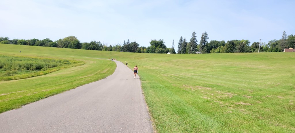 The course was an out and back that ran mostly along a paved path with curves and gentle hills through a riverside park paralleling the Red River of the North. The path was not shut down for the race, so racers had to navigate the occasional Saturday morning strollers, joggers, and cyclists.