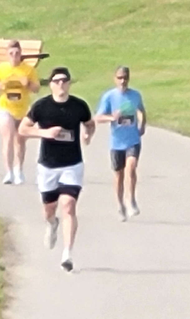 The water stop at the turnaround, funnily, was not a water stop. It was two young women at a table with a cooler in front of them. The cooler had in it full bottles of Gatorade. Julie was thirsty and knew she wouldn’t be breaking any speed records, so she grabbed one and ran the second half of the race holding a full bottle of Gatorade! Every once in a while, she’d stop to take a sip and then pick up the pace until the next stop to take another sip.