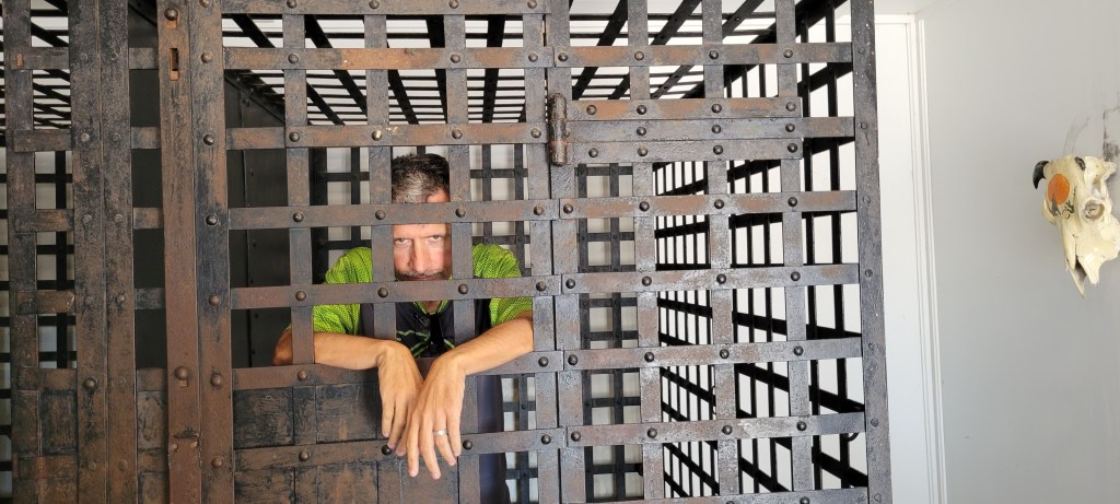 But we did leave, and we found that North Dakota was only just getting started in striking us with awe. We had a few more superlatives to hit – the world’s largest sandhill crane in the town of Steele and the world’s largest buffalo in Jamestown. Jamestown had an old timey town set up and we delighted in checking out each spot. The bank. The old post office. The old land surveying museum. The exhibit dedicated to Jamestown native Louis L’Amour (an author of Old Western novels). And, of course, the jail, where we both found ourselves convicted of some petty marital crimes for which we were ordered to serve time.