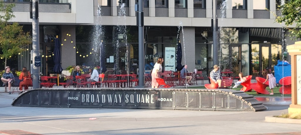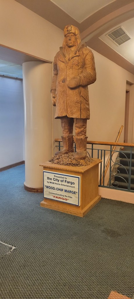 After our day in Fargo, as per her commitment to watch movies whose tie to a place we’re visiting is significant, Julie watched the 90s classic that bore the city’s name. Only now, after being in the actual city of Fargo and paying more attention, did she realize that almost none of the movie had anything to do with Fargo at all. None of the events happened in Fargo, and much of it happened in Minnesota. Still, Fargo is a snappier name than Minnesota. The movie, though disturbing, was great as always.