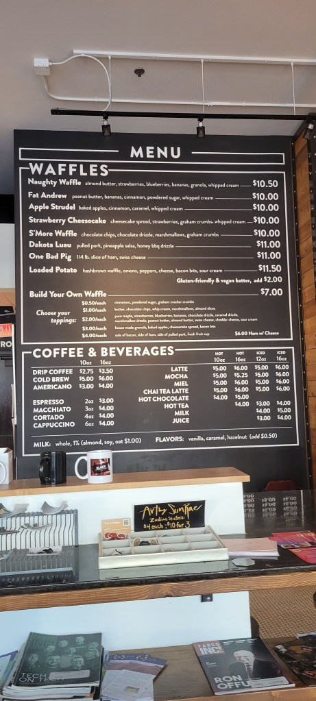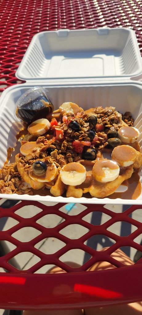 We hung out in Broadway Square Park. Ryan partook of coffee shops, Julie of boba shops. Julie found a place that specialized in waffles. When she found out they had gluten free, well, you know the rest of the story.