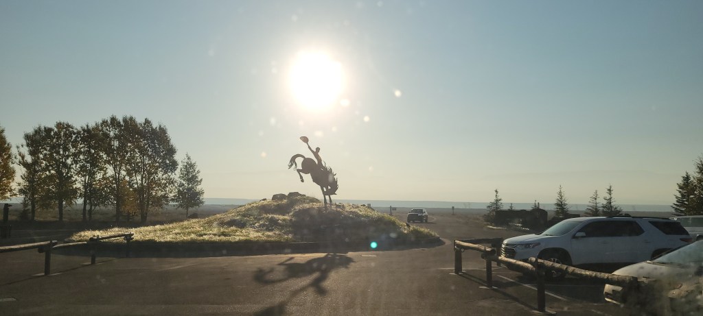After all this, we were already past our hoped for Jackson leave time of 1:00 PM, and we still had to make it to the post office. Julie’s sister will be turning 50 in October while we are on our trip, so Julie won’t be around to celebrate with her sister on this milestone occasion. So instead, Julie decided to celebrate the 50 years of her sister with a gift for her from each of the 50 states. Having just finished our 20th state, Julie now had 10 states worth of presents to pack and mail up, which was the max we had room to store before it was time to pop them in the mail. Then there were also the birthday presents for other endeared ones and the “no particular occasion” presents for her one nephew by blood that she couldn’t help buying throughout the trip. Gift storage had long turned out to be a significant part of space management in the van, as it turns out that buying presents for people along the way is one of Julie’s favorite traveling pastimes. We were stocking up on birthday presents and early Christmas shopping for folks. As a result, in addition to the presents that needed to make it in the mail on this particular post office stop, we had a bag full of them that would wait in the van for future occasions. Short story long, it took two hours at the post office to pack everything up for shipping. After a handful of other things that chewed up time, we didn’t actually cross the border out of Wyoming until 4:00 PM.