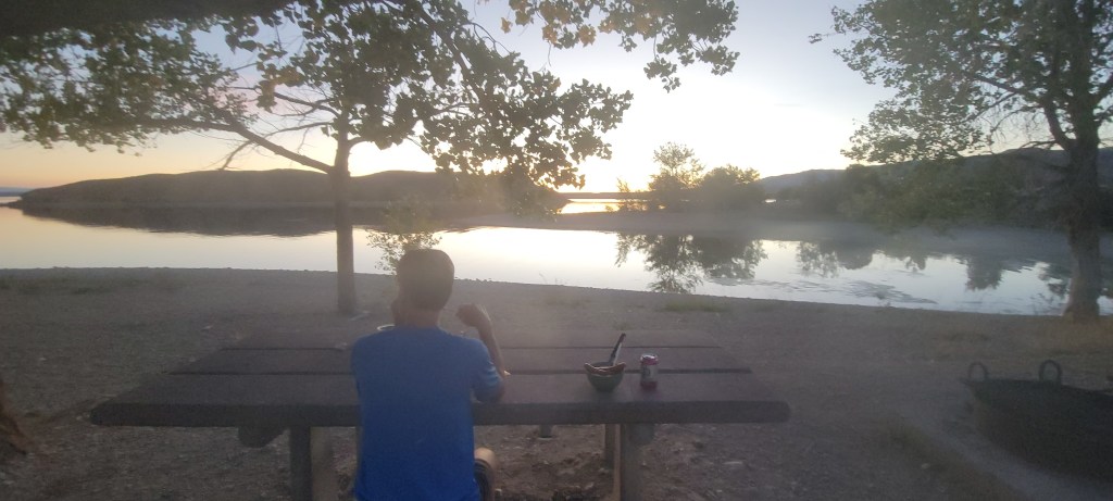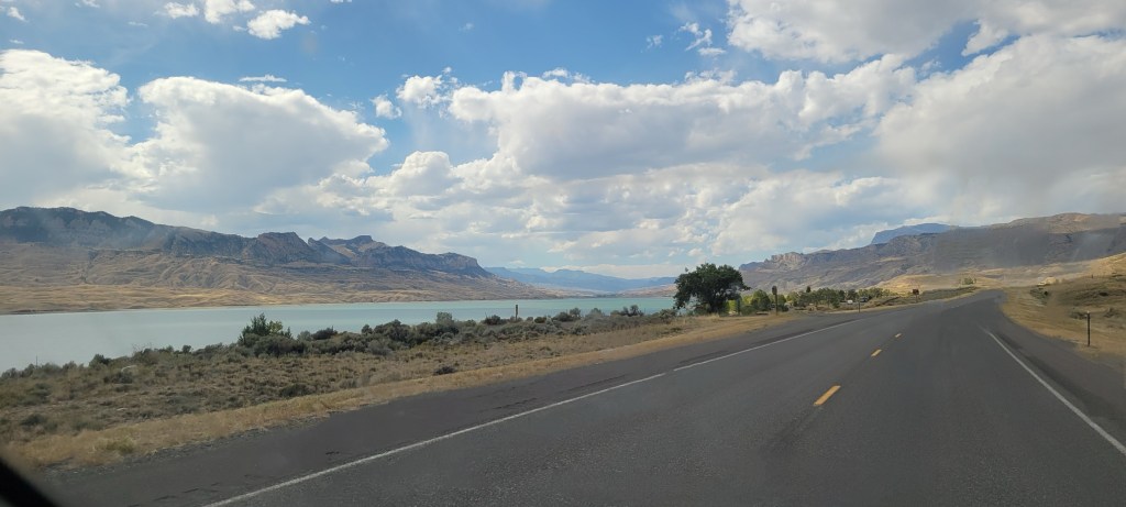 On our way towards Thermopolis, we found ourselves among some of the most stunning scenery of the trip so far. Hills and mountains began to rise up from the once expansive and vast lands. Large bodies of water, reservoirs, started to show up with glistening colors. We were slack-jawed at every twist and turn through it. Then we rolled past a sign that said “Campground” with an arrow pointing to the side of the road. We saw a campground right on the water amidst the mountains. We couldn’t believe what we were seeing. We didn’t have a pre-booked place to stay for the night, as Julie had taken a bet that something in the area would come up to surprise us, and that bet paid off big time.
