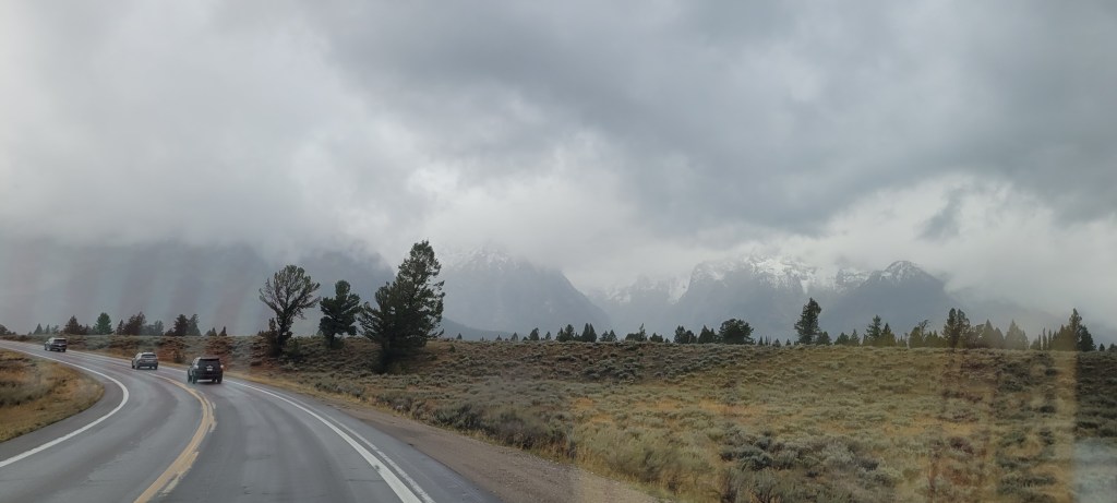 Our final day in Wyoming, we made our way to the stunning town of Jackson, where you could tell the more monied Wyomingites called their home. The town was charming, beautiful, and in a setting that was stunning. It was only when driving from our campsite to Jackson that we got reminded – wait, we are in Grand Tetons National Park! We didn’t have time to hike there, but the views, even on a rainy and cloudy day that blocked much of the Grand Tetons themselves, were stunning.