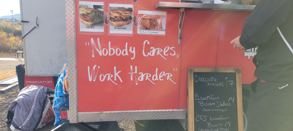 Greed plays a role in the race report for Montana. When we arrived at the race scene, there were food trucks and booths for different local community organizations giving away swag and sharing information about their various important causes.