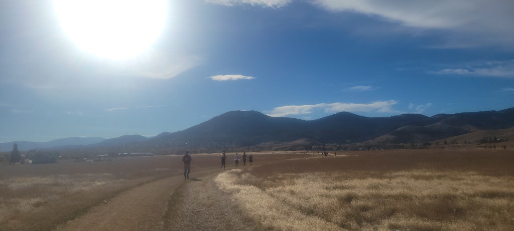 The course was a lasso with a two-mile loop at the end of a half mile rope. We began at the end of our rope, ran along it to the loop, ran clockwise around the loop, then back down the rope to finish where we began. We ran through the dry yellow grass in the gently undulating open fields of a nature preserve, the bone-dry dirt and stone path crunching with every footfall. The mountains ringing Helena in the near distance and Montana’s ever-present big sky made it all seem wide open and epic.