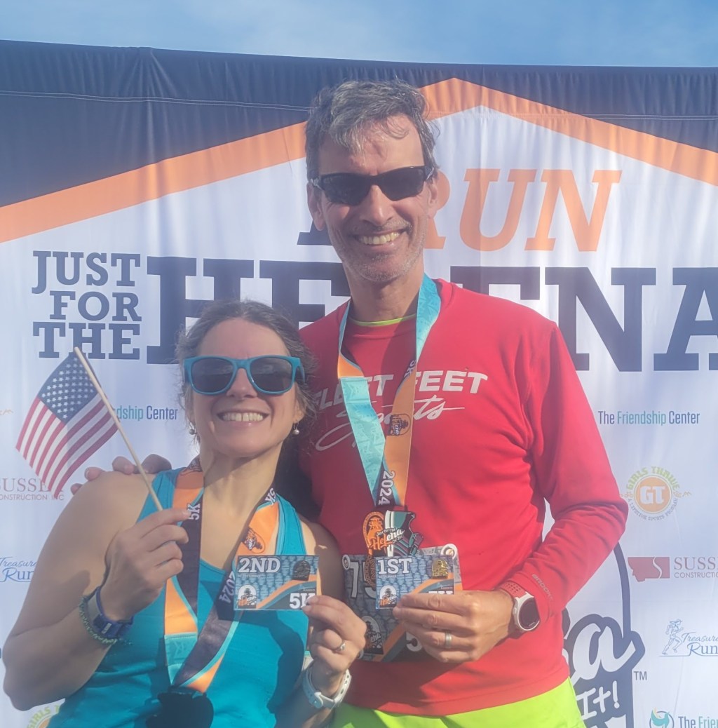 When we got our results, it turned out we both placed in our age group – Ryan first, Julie second. We headed over to the swag table excitedly.