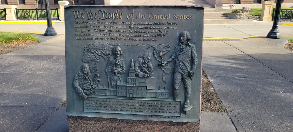 We got an early start in the morning to hit the state capital of Pierre. We drove through miles of open plains and farmland and found it all quite beautiful. We were impressed by South Dakota’s capitol complex and toured another stunning state capitol building, this one created by the same folks that did Montana’s in Helena. It was similar to Montana’s in a lot of ways, except for the nature of the paintings and statues and the color scheme. We chatted with the receptionist in the governor’s office and, as we do in each capitol, asked if the governor was in and available for a chat. So far, no dice. Governor Noem was in Sioux Falls for the annual pheasant hunt.