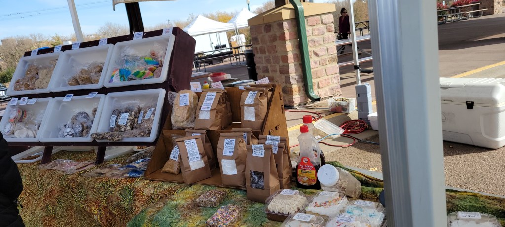We had been talking about kettle corn and how it had been so long since our near constant summer supply of the delicious treat. Lo and behold it was the first thing Julie spotted upon arriving at the market. Julie raided one stand that sold various herbal concoctions, from soaps, to tinctures, to bath salts. Once again, Ryan – who had self-appointed himself at this point the “gluten-free/dairy-free wingman” for Julie – came walking up to tell Julie they have some vegan baked goods over there. Julie had thought, well, maybe there are one or two things I can eat. Ryan didn’t realize it, but the entire booth was gluten-free. Everything. And a handful were also dairy-free. Julie bought more treats than is wise, and she did it with a big stinking grin on her face.