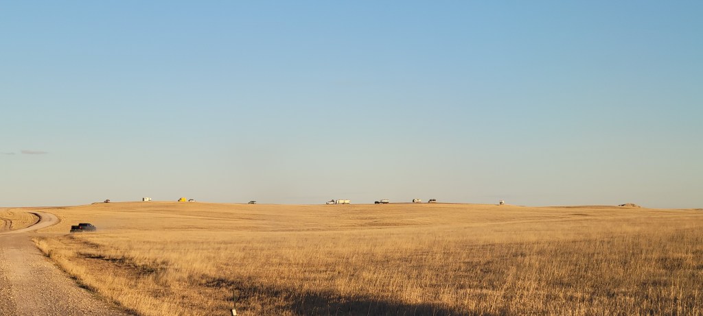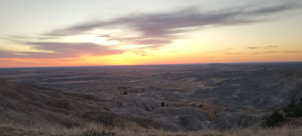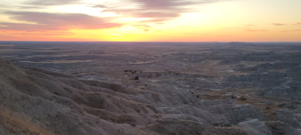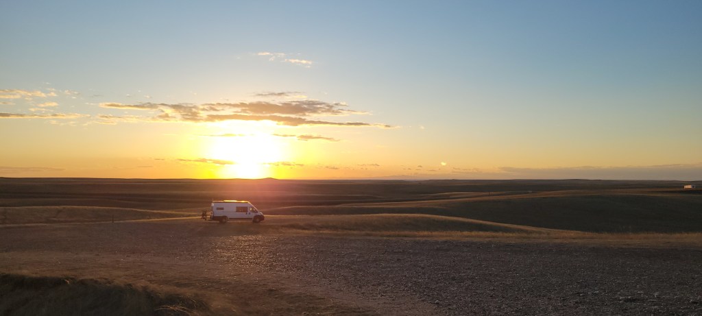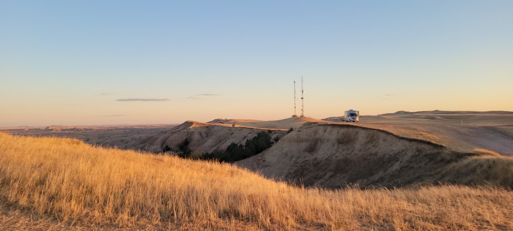 We found a place to park for the night that made it onto our short list of best overnight spots. It was on an eight mile long dirt road on a ridge just outside of the national park that is open for boondockers. We saw it as we drove into the park, a line of 10-20 rigs of different sizes and shapes sitting on the horizon. When we joined them in the evening, our jaws dropped. This road sat at the top of a ridge overlooking miles and miles of badlands. We were definitely feeling our good fortune of getting to live like this for this time as we watched the sun set behind us and the brilliant sunrise come up over the ridge in front of us in the morning.