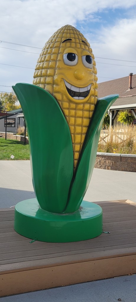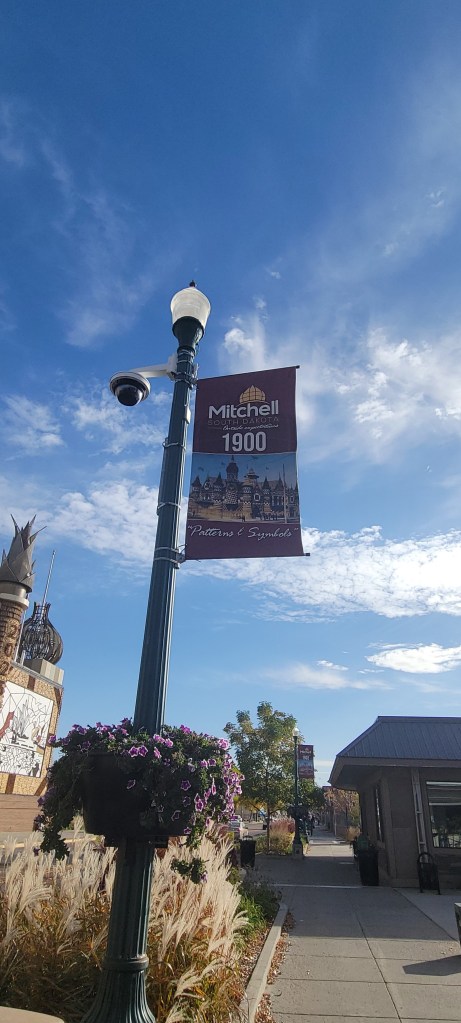 After our short stop in Pierre, we carried on east until we hit the town of MItchell, home of the World’s Only Corn Palace. It’s a small arena with a basketball court, a recessed stage, and an outdoor series of murals made entirely out of dried corn. The murals are redone every year on a different theme, this year’s theme being Notable South Dakotans. We read the plaques that described the history of the country by decade and how the corn palace has commemorated the changing times of the nation alongside it.