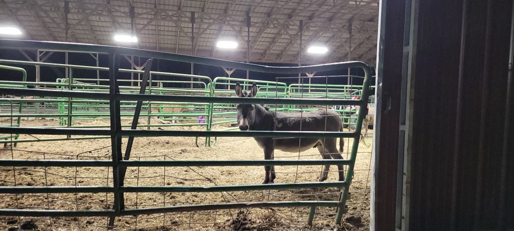 Before long, we had all made our way over to the cattle barn where we got to meet, if our memory serves us as to the correct type of cow, their baby Scottish highland cow. We found out the sad story of how the calf’s mother had had poison milk and how someone had solved the problem of how to get mama and baby cow some qt together by creating a cow bra that they would put on the mama to keep the calf from feeding from her, but they could still be together.