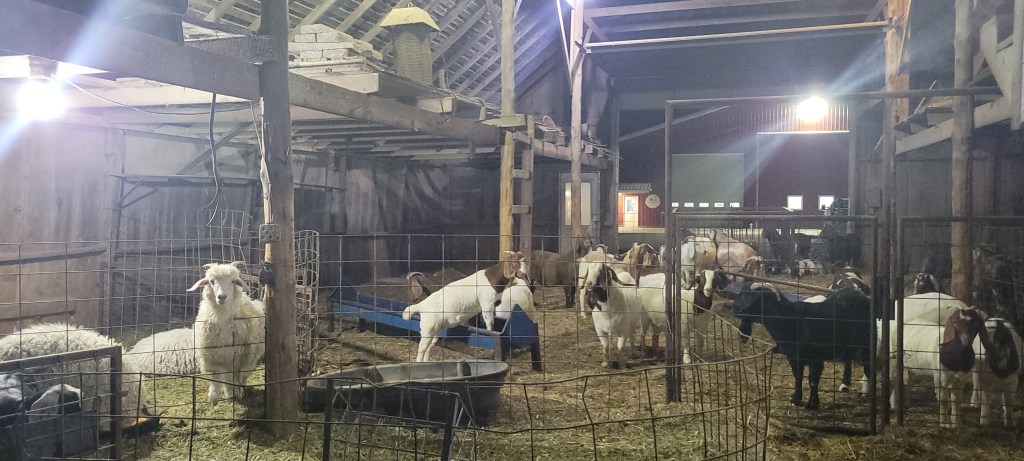 After we grabbed a spot and got settled in, we met Carrie by the barn that was brimming with goats. The ones in the back seemed uninterested in our visit and content to mill amongst themselves, while the ones in the closest pen lifted their front legs to the top railing of the gate with all the eagerness of a puppy leaping at the door as their person approaches after some time away. They looked like they could leap right over it if they wanted to – and they looked like they wanted to – and they eventually did.