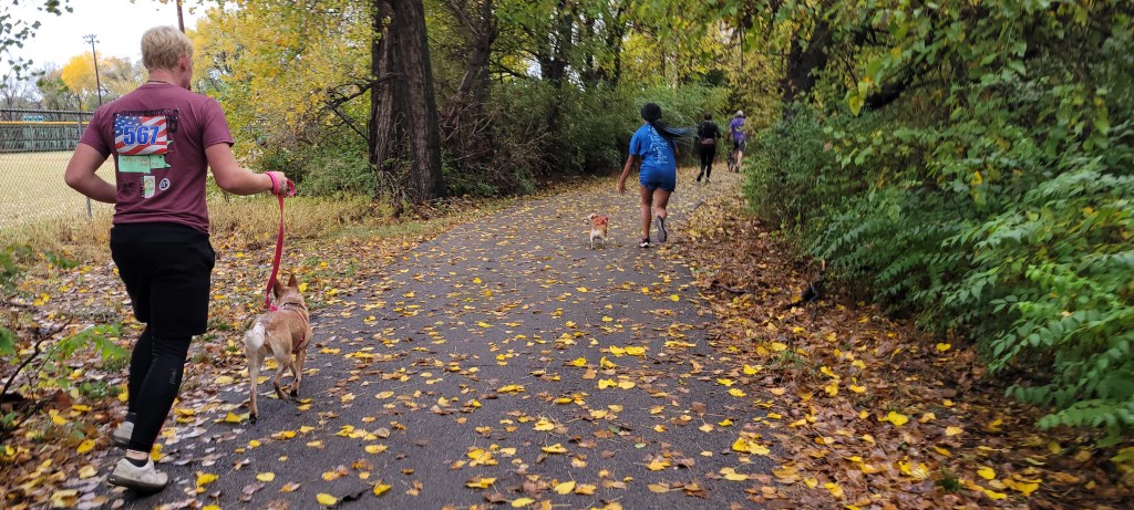 The dog-centric nature of the race was fun for the dogs and dog owners who participated, but not so fun for other dog and dog owners in the area. A woman out for a walk who was not part of the race had to restrain her dog, who was barking forcefully and lunging at the first two dogs in the race as they ran by. She gave an ‘oh great’ smile when Ryan told her there would be a whole bunch more dogs coming along.