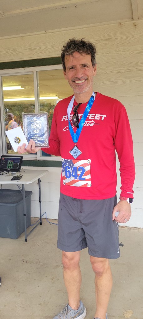 We headed into our second race for the weekend with much the same goals as our day before. Julie’s goal was to take it even easier, and she found a woman early on in the race that she used to force herself to go slower than her legs wanted to go. Once again, her legs hardly felt like they were doing anything, but her cardio fitness revealed its limitation. She was able to keep her average heart rate to 170. Not terrible, not nearly as low as she hoped, but she just couldn’t bear running any slower. As long as she got her negative splits, she was happy. She clocked in a gentle 9:49 for lap 1, a 9:39 for lap 2 and a 9:25 for lap 3 for a total of 29:48. Julie was finding it mildly painful to have so many times at this pace, but also knew it was important if she wanted to regain her cardio fitness at some point. She wasn’t expecting to get an award at that pace, but the race, at least in her age group was not overly competitive, and she walked away with 2nd place in her age group.