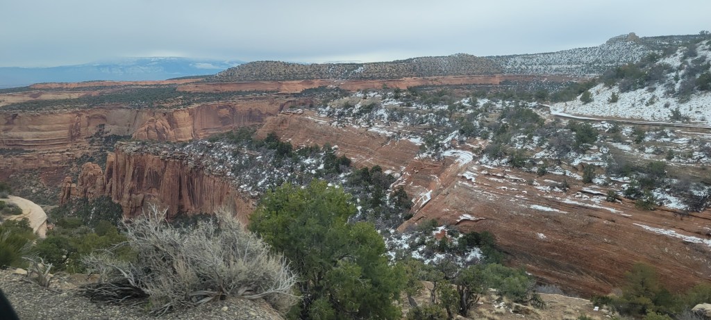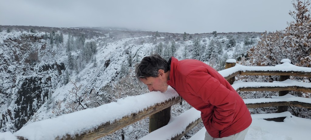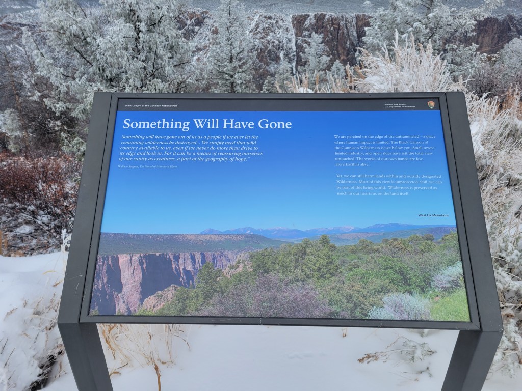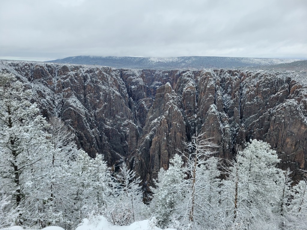 In the morning, we made our way into the Black Canyon of the Gunnison National Park in the sunshine and were immediately taken aback by what it appeared that we had been sleeping amidst all night. Again, the pictures can more than speak for themselves. We knew coming into Colorado, we would be delighted by striking mountain views from nearly any nook and cranny we would visit, but this view was one we wouldn’t have even dreamed up even if given free reign to do so. Never before had we seen rock striations like this that were vertical and with this smokey blackish brownish purplish hue that glowed underneath the snow that covered it. All that with a view to the meandering river flowing so casually so very far below us through this awesome canyon.