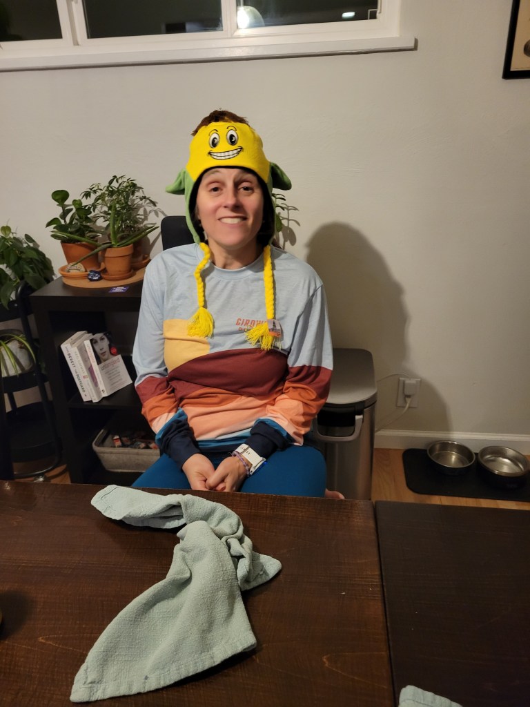 We had a great time with a short but sweet family visit that had the added benefit of also being a tremendous pit stop replete with laundry machines, hot showers, toilets that don’t fill up after so many uses and a repository for garbage and recycling. We brought some housewarming gifts including a hat that Julie had bought at the World’s Only Corn Palace in South Dakota and wondered if it would be too young a present for her almost 12 year old second cousin, Hannah. Once getting the subtle signals that Hannah might not be excited to wear it, Jodie made the astute observation that Julie had seemed to really wanted to keep it for herself along. It may have been too ridiculous for a 12 year old, but at 45, Julie was all in for it. Jodie’s observation of Julie’s yet unembraced desire turned out to be very accurate. Much adult conversation was carried out while Julie delighted in her new hat.