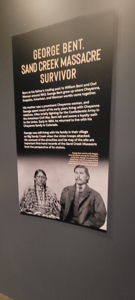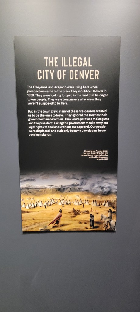 Julie was dead set on hitting the state history museum that we had missed the day before and she was so glad she did. It was four floors of one fantastic and educational exhibit after another about the history of the land that is now called Colorado, starting, of course, with information about so many of the first peoples that had made this land their home for millenia. While the history in each state is unique, in many ways, there is a common story of what happens when the mixture of manifest destiny and a hunger to mine what could be found in the earth and was deeply valued by the European settlers came into contact with the people that had made that land their home for so long. The story has some degree of nuance in each place, but also so much of it is the same disturbing sequence of events from one place to the next where one group of people and their way of life was overtaken, looked down upon, brutalized or subjugated by folks that stood for ideals of liberty, democracy and freedom. Oftentimes there are broken lineages, broken treaties and broken bodies strewn about in the wake of this convergence of cultures and the stories usually end up with people that had once been nomadic to one degree or another being forced to relocate or change their lifestyle to be able to fit into the bounded home they would now be forced to live on. Julie learned about pieces of that story for those natives that had lived in the various parts of Colorado for eons before it became known as the state of Colorado. She was particularly appalled (but, unfortunately, not surprised) to learn about one of the most brutal versions of this oft repeated story when she entered the tremendous exhibit in the museum about the Sand Creek Massacre. If you are not already familiar with it, it is worth looking up and learning about – not if you are looking for a pick me up – but if you are interested to bear witness to some of the sobering and horrific pieces of American history and the legacy that they leave.