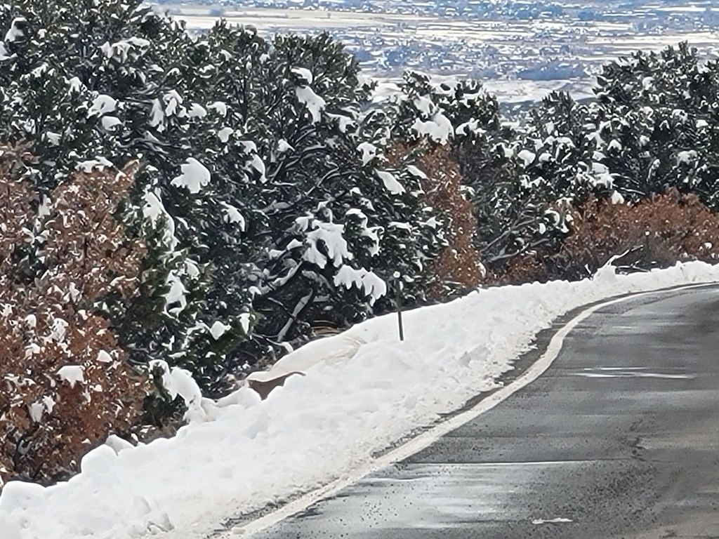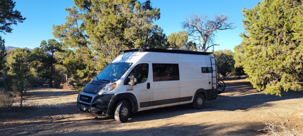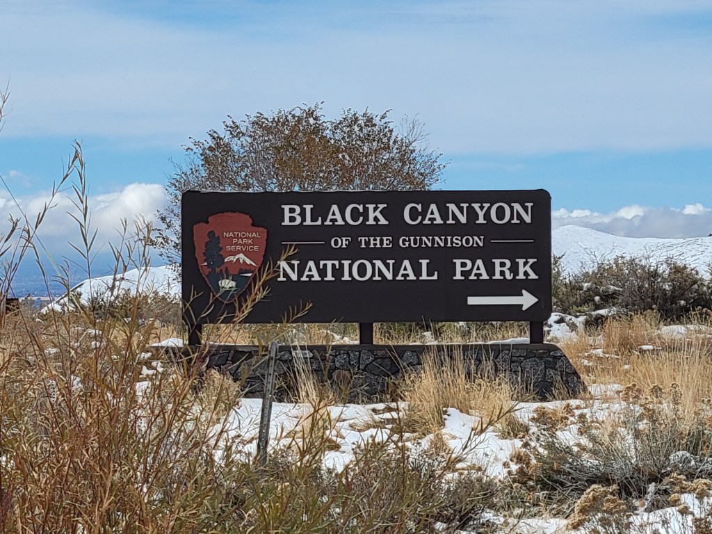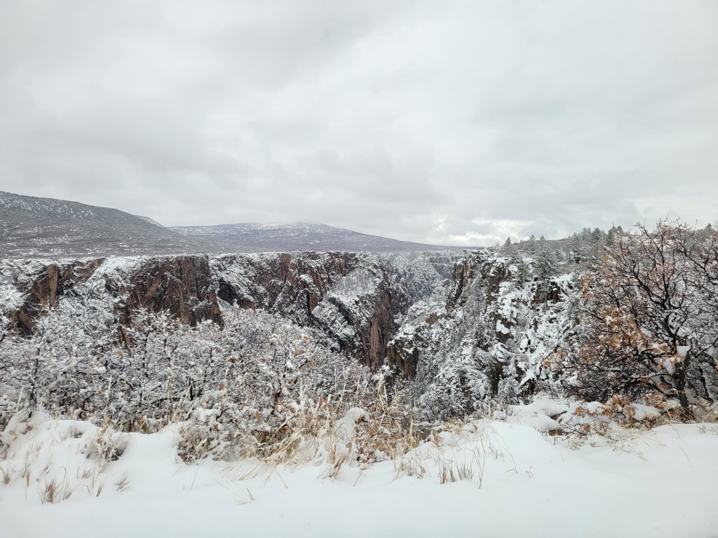 We made our way along the mountain roads as dark started to settle into it’s place for the night at the first of Colorado’s four national parks that we would manage to visit – Black Canyon of the Gunnison National Park. We rolled into the first come first serve campground that was covered in a soft blanket of newly fallen snow – the branches of the shrubs and bushes throughout the campsite were glowing white. Well, we were both the first come and the only served. We were the only ones there. We meandered around the two campsite loops that were made accessible by a snow plow and found that, while the loop itself had been plowed, very few of the sites were. We found one site on the loop that was melted enough that we felt comfortable driving into it, knowing that, if we got stuck in this spot, we were not going to have much help getting out so we wanted to play it safe. It was pretty romantic falling asleep under a brilliantly starry sky in a winter wonderland that we would have all to ourselves for the night. And, thank goodness, our heater was still on board for keeping us warm without any fumes involved.
