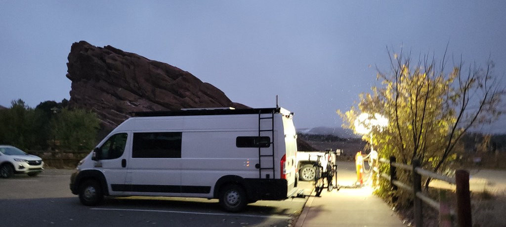 We started off our time in Colorado with one of our longest drives of the trip so far. There is no straight shot through the 50 states of the USA, and if you add in that you not only want to pass through each state, but explore as much of it as possible and end up, somewhere along the way, in a location where there is going to be an organized 5K race to run, there is going to be some zig zagging. That fact was never more pronounced than during our time in Kansas, leaving us as far east as Wichita on the morning that we intended to start our visit to Colorado and a solid 7.5 hours from our first itinerary stop – Denver. We opted to cut the drive a bit down to 6.5 hours which was enough to get us over the border and to a great spot to park for the night, Richmil Ranch Open Space, a park in Arapahoe County about an hour outside of downtown Denver. We had both been to Colorado a handful of times before, so, while there was much of it that we would discover in our time there, we had some sense of what to expect in terms of purple mountain’s majesties and all that jazz. We didn’t have much of a sense of the part of Colorado that was the west end of the prairies that we had seen so much of in prior states. And it was gorgeous in a new Colorado prairie sort of way. Our first parking spot for the night was the perfect spot to view it, with dark skies to sleep under, a small circular gravel parking area to park in, two conveniently located port-o-johns to, well, you know what in, a small picnic table pavilion, and 350 acres of open Colorado prairie all around us.