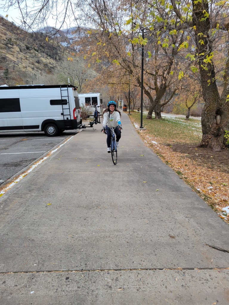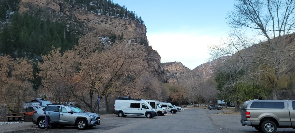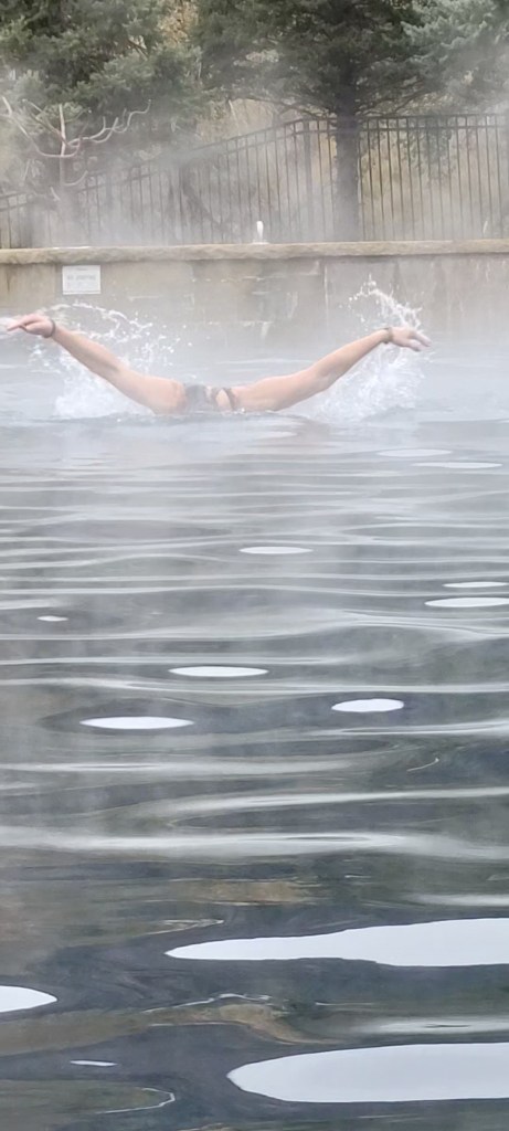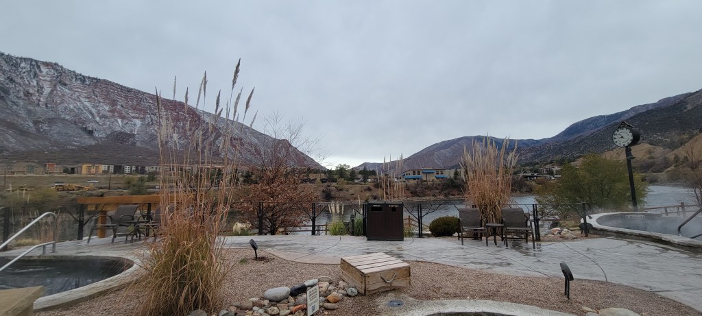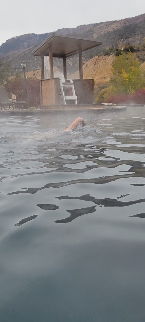We stayed cozy in our fume-free, well-heated van and enjoyed a short but relaxed and productive morning. Julie hopped on her bike and took in a short 5 mile ride alongside the Colorado in the frigid air before we headed off to Glenwood Springs to take in a soak at the Ironmountain Hot Springs, warming ourselves amidst the view of a stunning mountain backdrop. We got in our Colorado swim in the large mineral pool as we did laps in the most lovely warm water and crisp, cool, almost winter air. It was delightful.