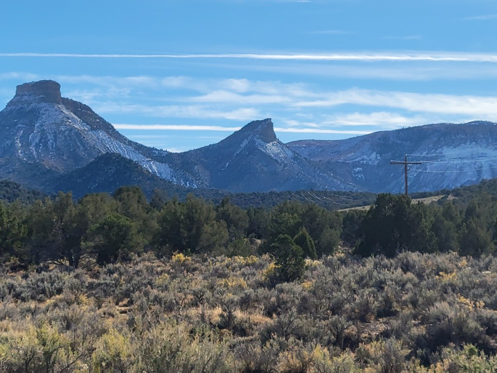 We visited two national parks and one national monument. We drove, walked, biked, and/or ran through mountains, canyons, mesas, buttes, and rock spires. There were red rocks, purple rocks, and orange rocks. We saw elk, bighorn sheep, and mountain lions in the wild. Rivers and waterfalls, sun and snow, and distant views.