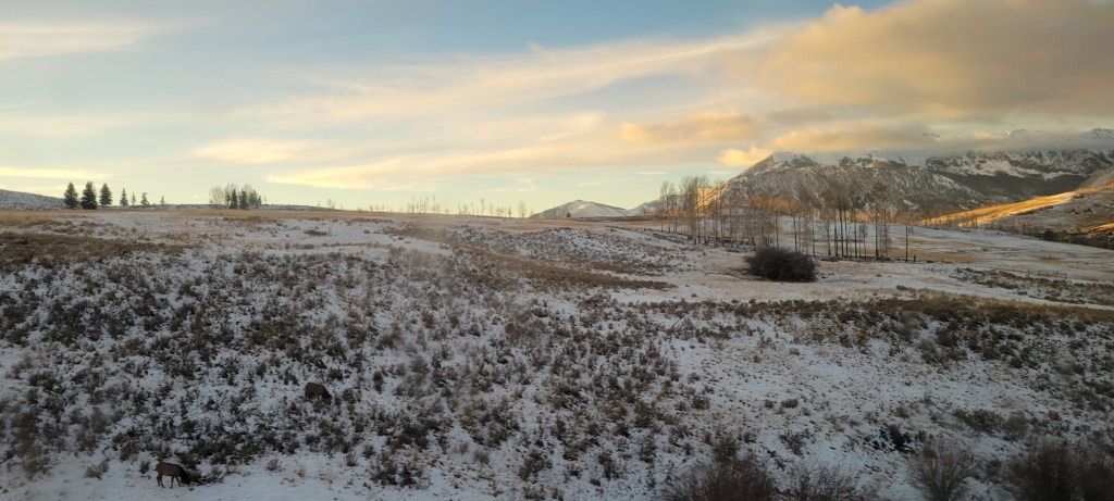 We stayed in roadside parks, friendly driveways, and remote campgrounds. We were in city, suburb, and open range. We visited family and friends and met new people. We dealt with heater issues and booked appointments for new tires, suspension work, and an oil change. We also ran into the first weather event that impacted our itinerary – an early season Rocky Mountain snow storm.