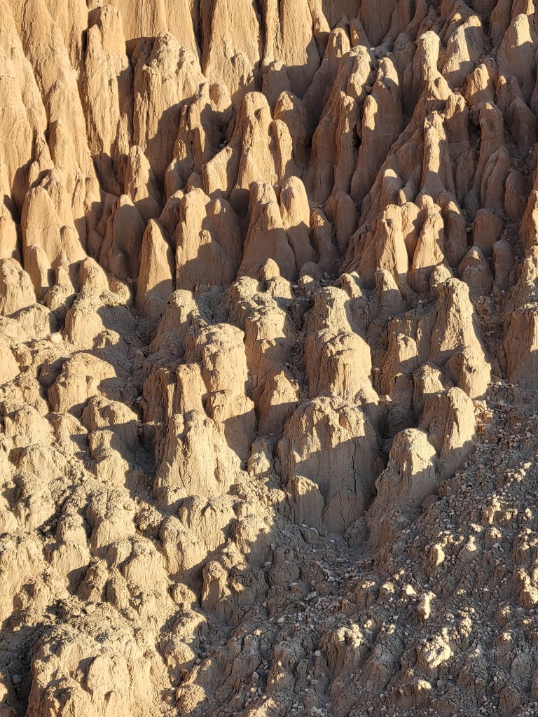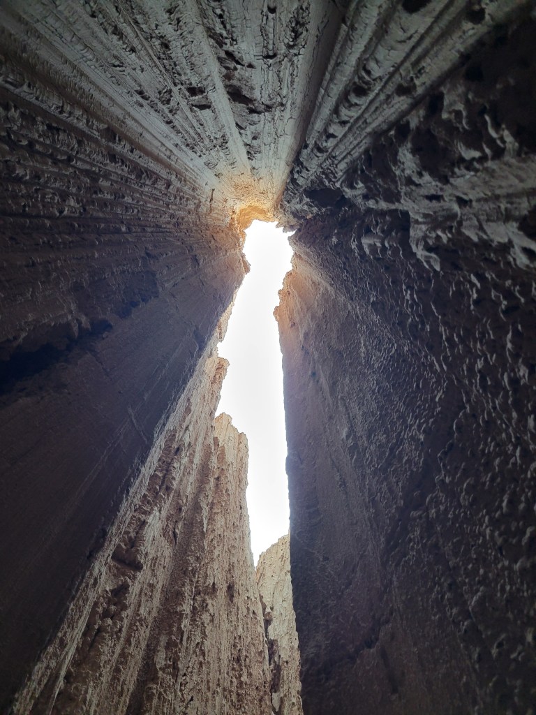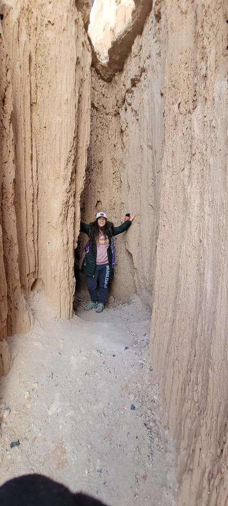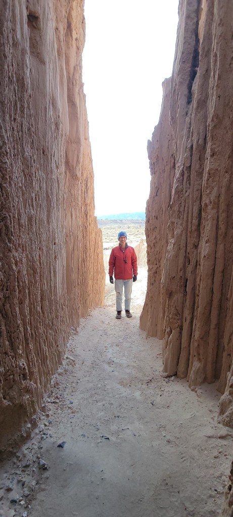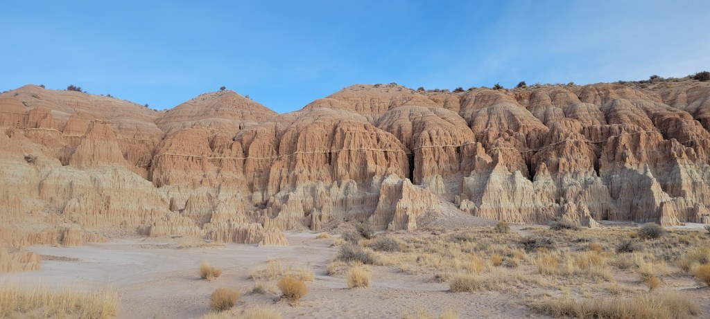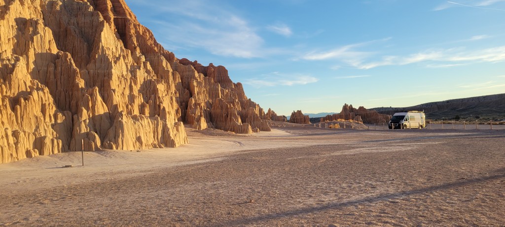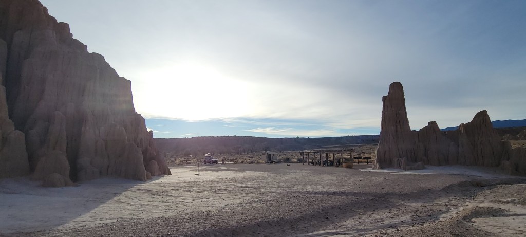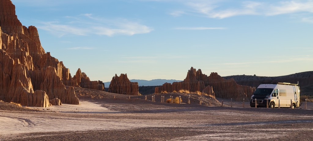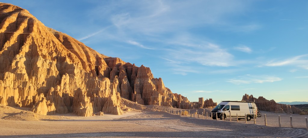 By mid morning, we were on the road again, heading north from Las Vegas towards our next stop, Cathedral Gorge State Park. We would have only an hour to enjoy the stop and that turned out to be more than enough since the beauty of the park and its moon rock formations were right there at the road. Sneaking in between some of the tight canyons inside the cathedral rocks was pretty amazing. We hopped out of the van and enjoyed a short hike to Miller’s Point where we took in the stunning views of the park. We were now in territory that our friends had encouraged us to skip due to its lack of beauty – and boy do we beg to differ. You can check out the pictures and decide for yourself.