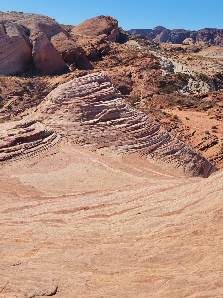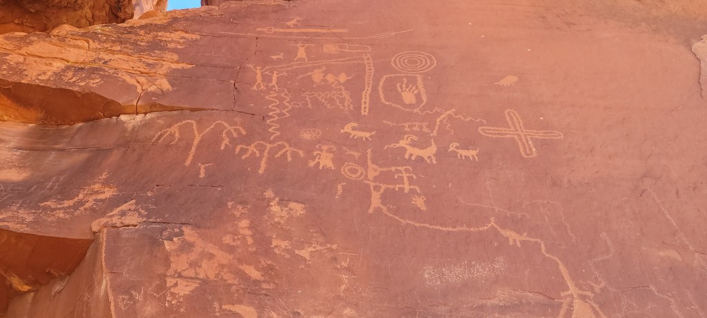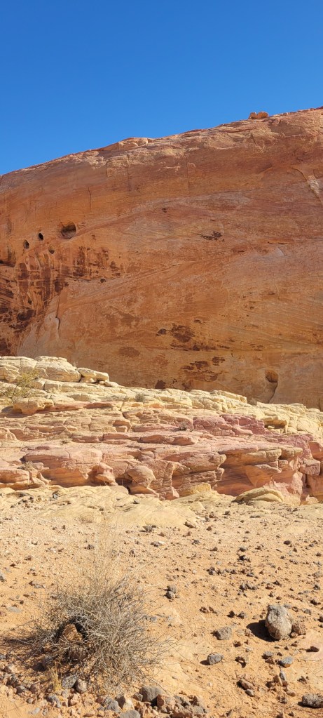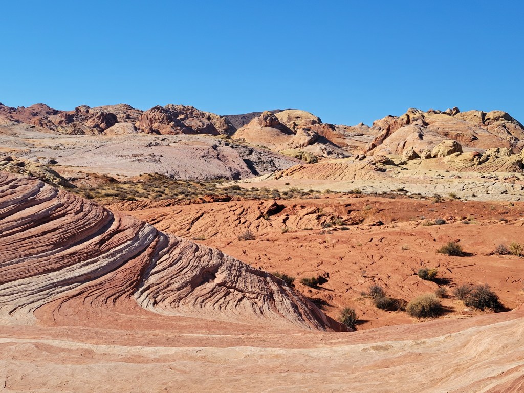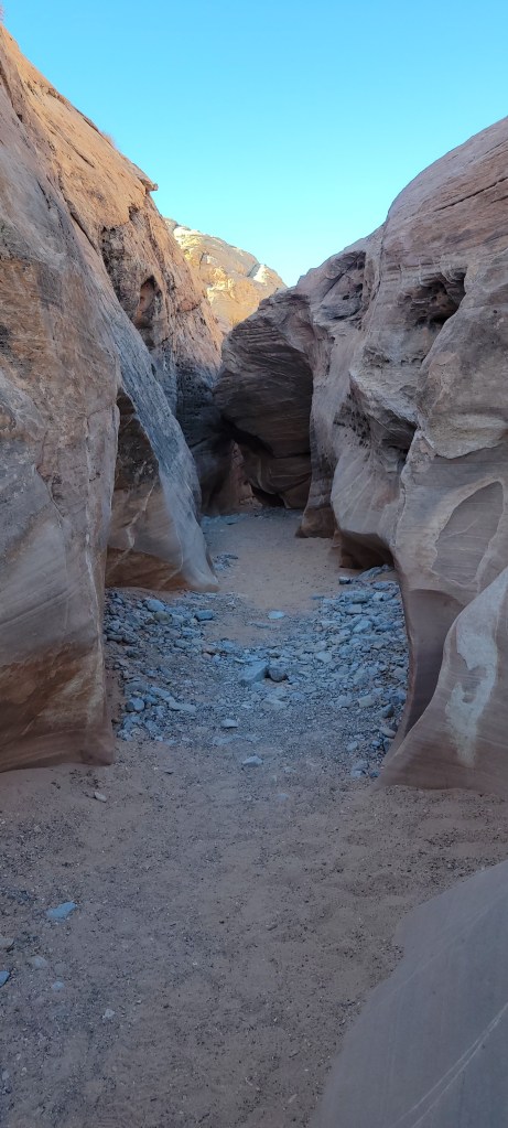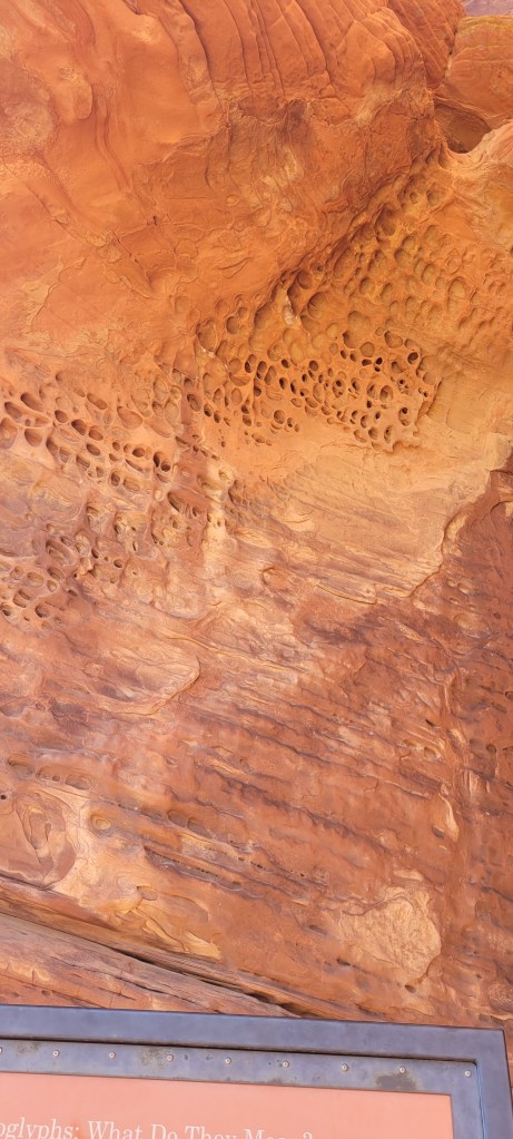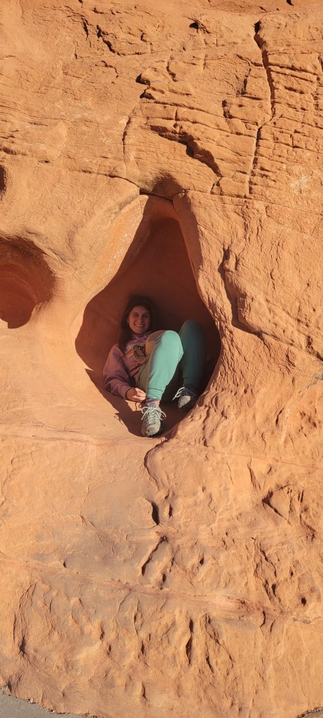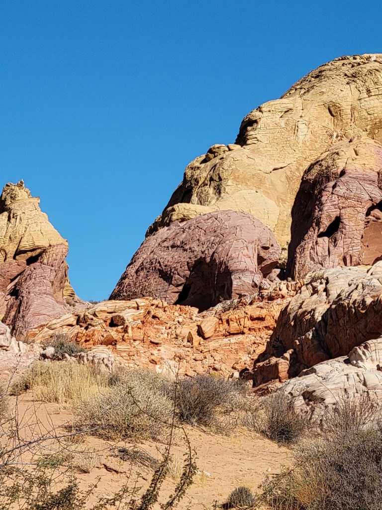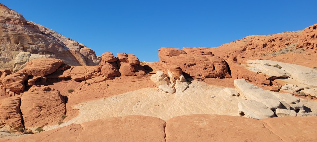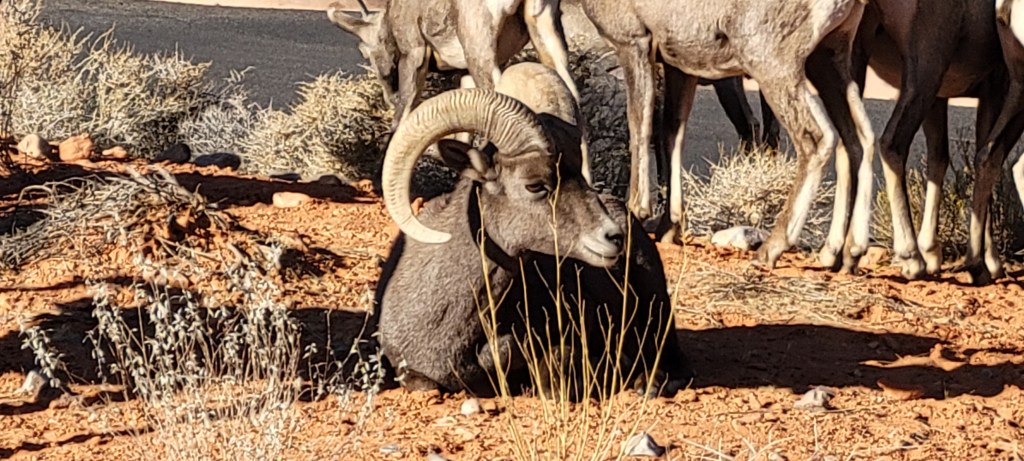 The next morning we headed into the park and took one of our favorite hikes of the trip so far. We stumbled upon a cluster of about a dozen bighorn sheep hanging out by the Visitor’s Center before it opened. We saw a rainbow of colors in the rock formations we climbed over and the slot canyons we walked through. We saw petroglyphs on huge red rocks that jutted out of the earth. We both ranked Valley of Fire State Park, a virtual island of stunning red rocks in the middle of the Mojave Desert, as one of our trip highlights.