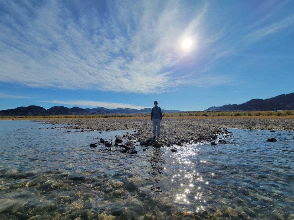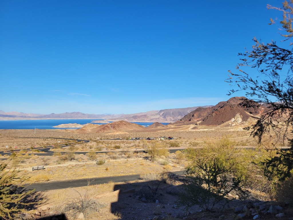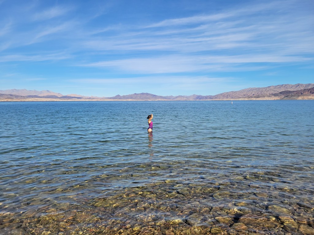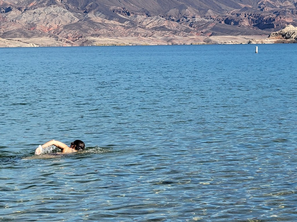 Our next stop was Lake Mead, the largest manmade lake in the US when it is at its full capacity (which hasn’t happened since 1983). The scenery was stunning and Julie took one look at that lake and was heaven-bent on getting her butt in it for her Nevada swim. We ran into some lovely New Zealanders by the lake. You can read about our encounter with them in our People Along the Way section. Julie went to the water’s edge to dip her toe in and find out if she would be needing a wetsuit and was pleasantly surprised that the Mojave Desert in November brings some lovely temperatures for those looking to swim. Though the water was on the chilly side of warm, it didn’t dip into “cold”. Julie grabbed her goggles from the van and hopped into the water while Ryan was taking a nap. When she popped out of the water, Ryan was there at the water’s edge, grabbing some pictures of Julie’s swim.