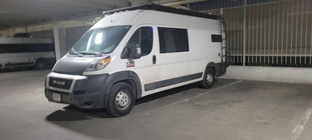 We spent our first night, and, perhaps, only night sleeping in a parking garage. Most parking garages cannot accommodate our height, but the first floor of the Excalibur parking garage could and we appreciated the added security measures that the parking garage offered us while spending a night sleeping on the strip. And, even though we love parking in gorgeous spots, it turns out, when we put up all the window coverings, no matter where we are, it still just feels like home.