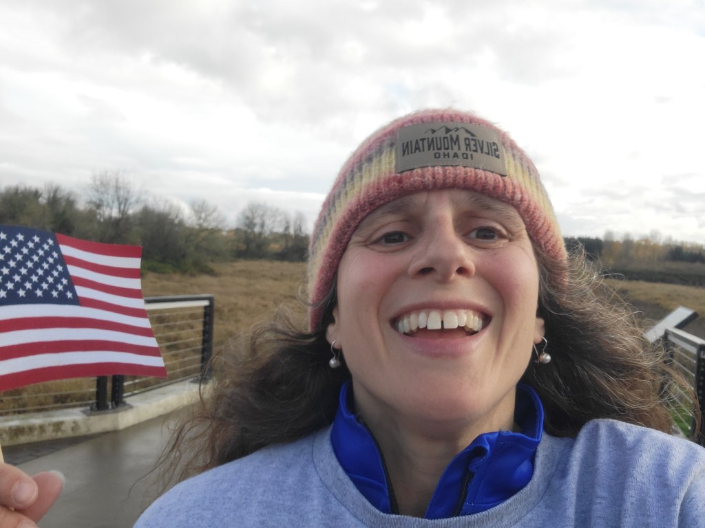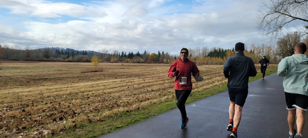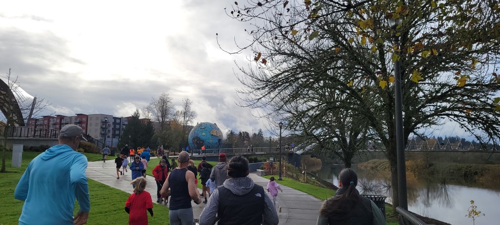 The race started in gray 40-degree weather at Riverfront Park, crossed the Willamette River (it’s Willamette, dammit), ran by the meadows and trees of undeveloped Minto-Brown Island Park, then returned to Riverfront Park. The course was an out and back along a gently curving, gently sloping paved park path. The only hill was the arc of the footbridge that crossed the river near the beginning and end of the race. It didn’t feel like a hill a tenth of a mile into the race, but it felt like one at Mile 3.