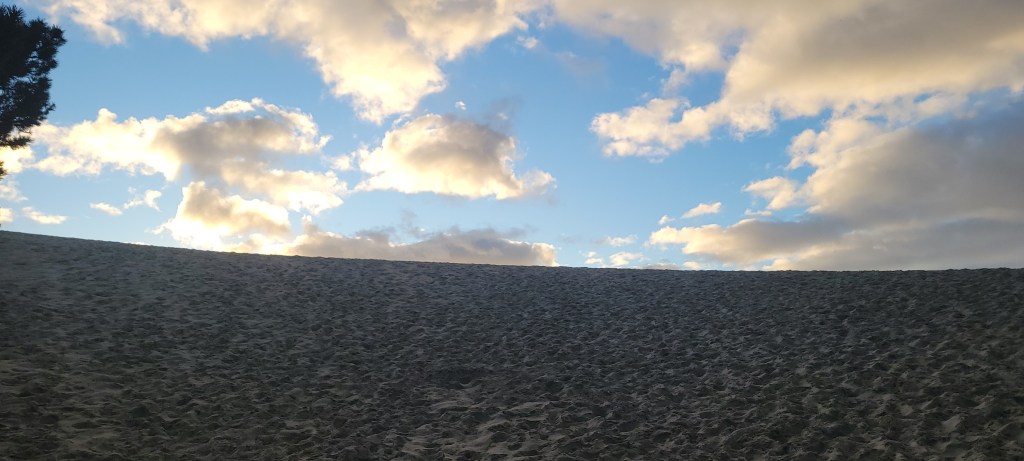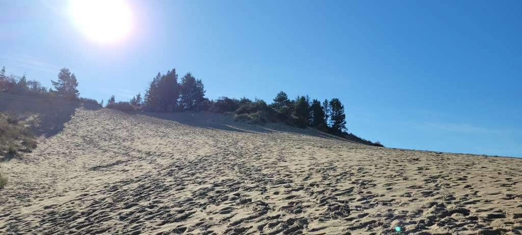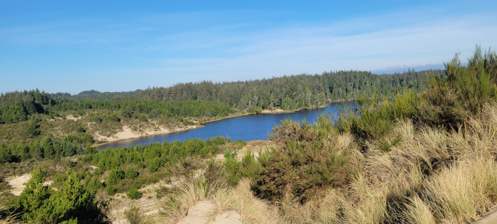 It was a great Thanksgiving morning. She hopped on her bike and headed back over to that lake to check “swim in Oregon” off the list. When she first stepped in the cold water, she thought, hey this is not so bad, no wetsuit needed. Soon after, Julie realized she may have, at some point in her life, destroyed the nerve endings in her feet. The deeper she got in, the more clear it was that she would DEFINITELY need her wetsuit. Luckily she had brought it with her on the bike. She put it on and stepped back in the water. By the time her hands were in, it felt like they were on fire. She took a deep breathe and got all the way in, took enough strokes, including head under the water to count it and then, once she couldn’t feel her face anymore, stood up and peeled her wetsuit off. She put on some warm clothes and took a short hike on the dunes before heading back to the van to empty the grey water tank and then hit the road.