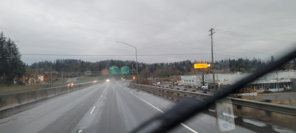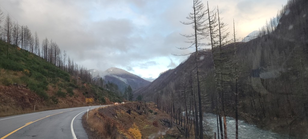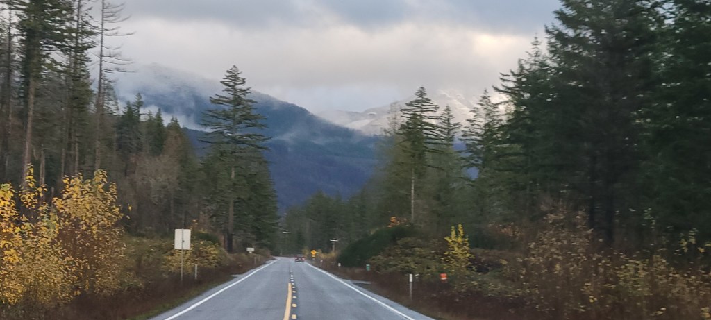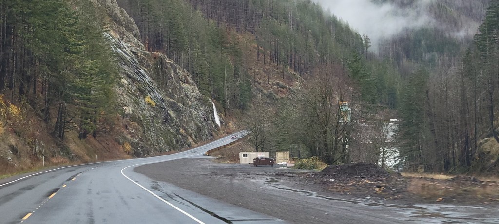 In order to make it to our 5K in time, our last day in Nevada and first day in Oregon included what was supposed to be 7:5 hours of driving. We are not exactly sure how it happened, but it took us over 10 hours to complete those 7.5 hours. We left Washoe State Park (between Carson City and Reno) in the morning and made our way up through Gerlach and passed the Black Rock Desert of northwestern Nevada into Oregon through Klamath Falls. We managed to enter Oregon just when it was getting hit by a snow storm. We had intended to get as far north as McCredle Hot Springs, a bit north and west from the pull off for Crater Lake National Park for the night, but the storm and the mountain pass had other ideas for us. Even though it was painful for Julie to miss out on seeing Crater Lake National Park, it was made slightly easier by the fact that the Rim Road was closed for the season due to weather and it was unclear how much of it we’d even be able to see if we made it there. We spent our first night at a Traveling J Truck Stop parked next to a snow plow. Our race was at 10AM the next morning about 3.5 hours away. We woke up at 5AM, checked the road conditions and storm warnings and crossed our fingers and hopped on the road to pass through the mountains in the hopes that we would make it to Salem in time. Having grown up in Rochester, NY, driving in snow is not that intimidating and Julie hopped in the driver’s seat and we got going. The snow came down with somewhat limited visibility for the first 7 miles, we drove slow when we needed to and then, soon after that, the roads were easy. Along the way though, we reveled in the beauty of the winter wonderland in the mountains experience.