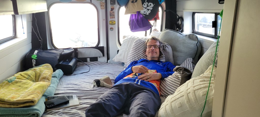 At 3 in the morning, Ryan’s wake-up alarm went off and, after repeated good-bye kisses, Julie was, once again, alone in the van. It’s the same scene everytime. When it is time to go, we lament the necessity to part, grabbing one goodbye kiss after another, trying to delay the moment. Every time Ryan is getting ready to go home, Julie whines a bit about his insistence to do so, just not wanting to see him go. Then, as soon as the departure happens, we both remember how much we friggin love being alone and immediately forget about this whole “I’m going to miss you” thing. We do miss each other, but nothing more than a few “Hey, how you doing?” Phone calls can’t fix. It doesn’t feel crowded while we are in the van together, but boy does Julie notice how spacious it feels when it is a van for one. 500 square feet all to herself! And she love, love, loooves the quiet with her own thoughts. No matter how simpatico two people can be, there is just something different when you hear another person in the room breathing – sharing oxygen with someone is just different than having a room full of it all to yourself. So, even though we both get plenty of solo time in the van together when we do our mornings, Ryan in his front corner office of the van and Julie in her back corner van spot, it is just different when completely alone.
