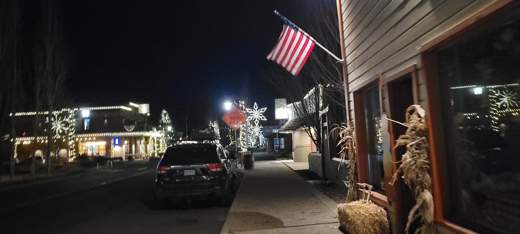 Once we were all clean and renewed, we headed east – as east as we would manage to get in Oregon. One of Julie’s fondest memories of the time she’d spent over the years in Oregon was a town called Sisters, so she was very eager to see it again and for Ryan to get a chance to take it in. It’s full of rustic mountain charm and surrounded by the beauty of the Cascades. We rolled into it just after dark. It was all lit up with Christmas lights and it was just beautiful. We grabbed some Mexican food for dinner and then headed further east to an RV park in Prineville. We had been parking in free spots for a great deal of the last week and it was nice to have hot showers and flush toilets.