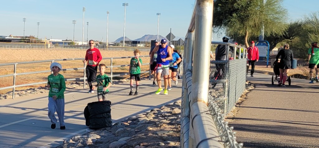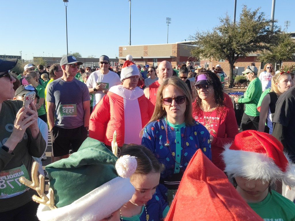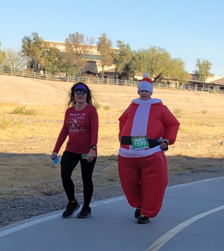 It was a weekend of Christmasy desert 5Ks. After running the Santa Paws 5K in Palm Springs, California, the day before, we ran the Run Run Rudolph 5K in Peoria, Arizona. And how did it play in Peoria? Smooth and easy under a bright blue sky, with a wavy line of Christmas green from runners in their long sleeve race shirts.