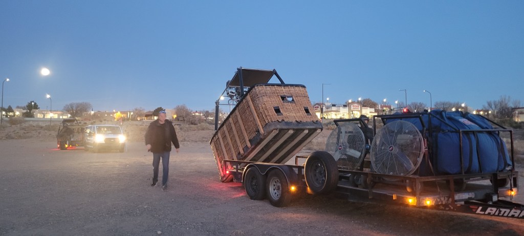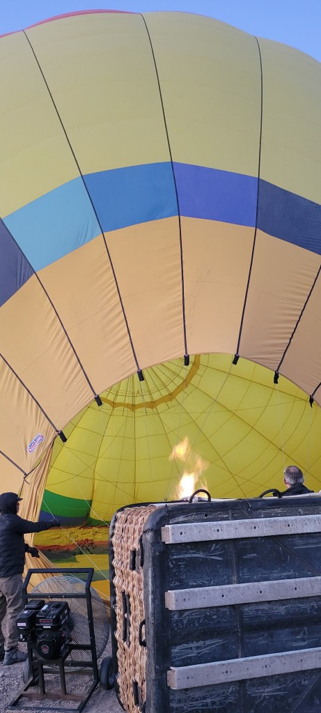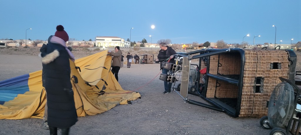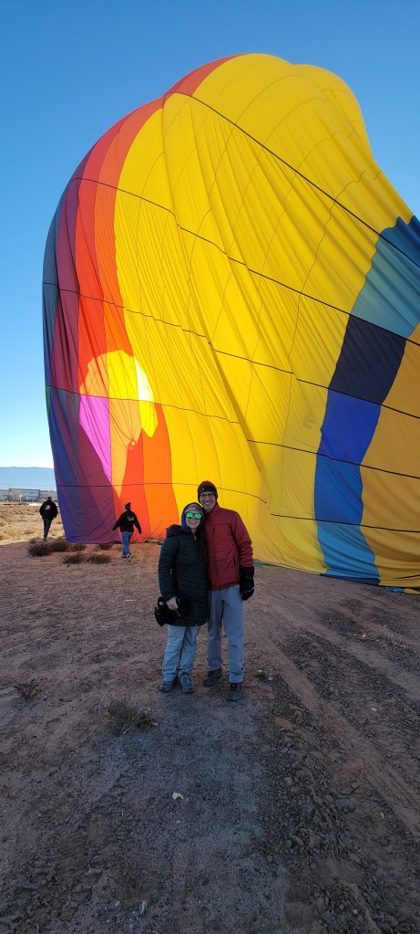 Beforehand, however, having never experienced being a human cloud before, we found ourselves getting to know some of our fellow future human clouds as we all shared the tingling feelings of excitement for the first-time adventure awaiting us. We got to chat with a woman who works as a nurse and lives in Fort Defiance, Arizona on the Navajo reservation near where we had just been. She was originally from Texas and told us that Texas has four very distinct sections within it with four distinct cultures. We told her we were looking forward to learning about it in our next state. She told us she grew up in a town right on the border. “It was a 10 minute walk into Mexico.” She said. Julie was fascinated to ask her questions about life on the border. We also sort of live in a border town, there being no other American town north of us before you get to Toronto. But, for us, it would be a 60 mile swim across Lake Ontario to land in Canada (or a 3 hour drive around the lake), so there isn’t as much of an international feeling. She told us that growing up there, like anyplace, things that wouldn’t seem normal to others was just normal to her. She knew the names of all of the drug dealers and human traffickers. Not that that was a particularly good thing, but it was just part of what was normal in the world she grew up in. Not asking more questions to learn more about that experience of hers is on our list of missed opportunities of the trip, but we enjoyed getting to talk with her as we all awaited the beginning of our floating adventure. She had come to fly in the hot air balloon that day because it was something she had always wanted to do and, one day, realized Albuquerque was only a 3 hour drive and she should just go for it!