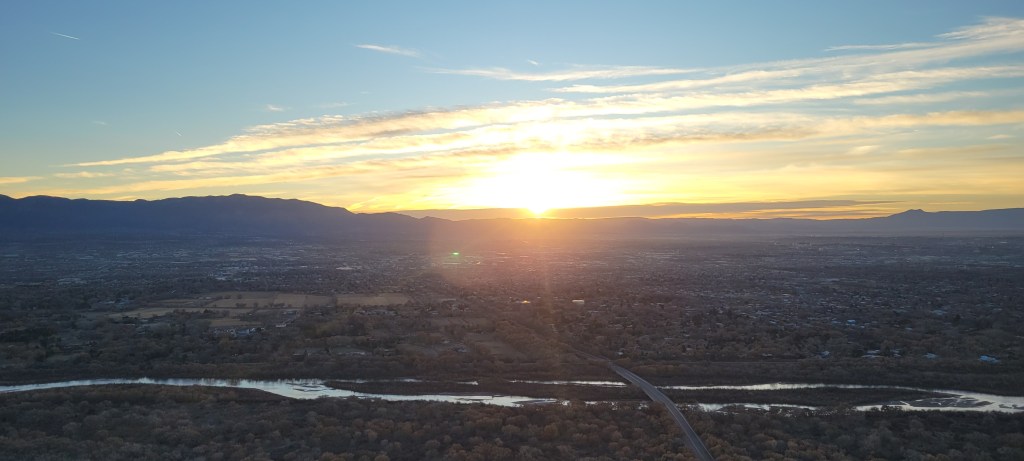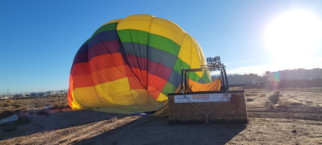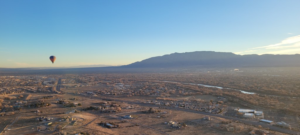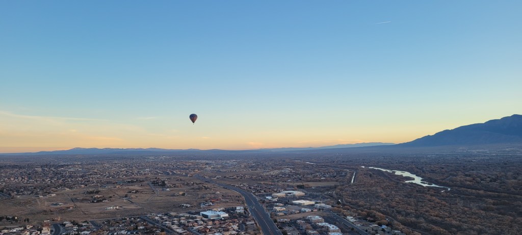 While up in the air, we learned that Anthony had been flying balloons for 8 years after having fallen in love with it as a kid helping out at the balloon festival that takes place in Albuquerque every year when the sky is filled with over 600 balloons. He knew before long that he didn’t want to be helping, he wanted to be the pilot. He moved from the little town of Farmington in northern New Mexico to Albuquerque and got his hot air balloon pilot’s license. He pointed our attention over to the balloon festival field where we could see at least 20 more balloons filling up and getting ready for flight that morning. He explained to us that these were not other companies taking up passengers, but just local ballooners heading up to the skies to enjoy a beautiful day. In Albuquerque, it is just another local recreational activity. Where we come from, on a December day, any number of folks might grab their downhill or cross-country skis, or sleds to head out to enjoy the fun that winter snow avails. Somewhere where the water is warm and waves are high, there are surely folks grabbing their surfboards to enjoy a morning catching some waves. And throughout the country, there are surely people heading out for a Sunday morning fishing adventure or maybe some hunting. There are no doubt people heading out for an early morning hike or neighborhood stroll through whatever scenery they are fortunate to have near them. All across the country and world, people recreate in whatever environment and setting they are living their lives in. And, in Albuquerque, heading up into the sky for some hot air ballooning is on that list. We learned that Anthony has two other balloons of his own, one with a little 2 person basket and one where he is simply harnessed into a little chair, where he can enjoy dangling his feet in the expanse below.