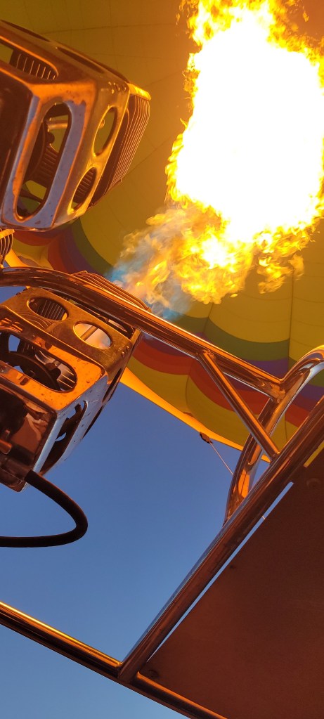There was, however, lots of chatting going on with our pilot Anthony who had encouraged us to ask questions throughout the trip, letting us know that he may occasionally interrupt us by pulling the lever on the propane causing a loud roar of flames overhead to cancel out any other sound that would be able to be heard. “I still have to fly the balloon.” He explained. We were all quite fine with being interrupted any time.